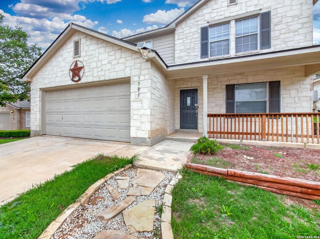 This 3-bedroom, 2.5-bathroom, two-story home offers 3,134 sq ft of functional living space and is situated in a cul-de-sac. The property features a rock-accented lower exterior, with siding throughout the remainder of the home, and a covered front-entry sitting area centered in front of the main window. The main level includes two spacious living areas, providing flexibility for everyday use and entertaining. The front living area offers space for a formal dining setup, while the kitchen includes an eat-in dining area. The kitchen is equipped with an electric stove/oven combination, microwave, and dishwasher. It also features laminate countertops, original light-colored wood cabinetry, and a large walk-in pantry that includes the laundry area. A half bathroom is located off the main living space on the first floor. Upstairs, all three bedrooms are located along with a loft area and an additional office, game room, or bonus space. The primary bedroom includes a tray ceiling with a