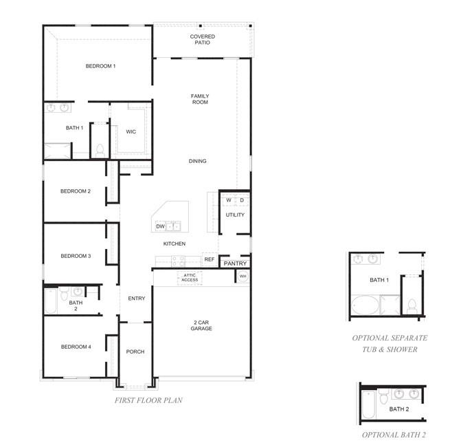 The Kingston plan is a one-story home featuring 4 bedrooms, 2 baths, and 2 car garage. The entry opens to the guest bedrooms, bath with linen closet. Center kitchen includes oversized breakfast bar with beautiful counter tops and stainless steel appliances. Open concept floorplan boasts large combined family room and dining area. The primary suite features a sloped ceiling and attractive primary bath with dual vanities, water closet and walk-in closet. The standard rear covered patio is located off the family room.