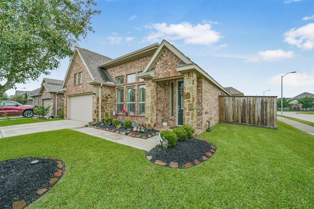 Beautifully maintained one-story brick home with stone accents offers comfort & style. Situated on an oversized corner lot, the property is conveniently located close to schools and shopping. Step inside the spacious foyer to find a flexible bonus area that can easily serve as a formal dining, home office or playroom. The open concept floor plan connects the kitchen, breakfast & family room, creating an inviting space for entertaining or everyday living. The kitchen is a standout with SS appliances, a gas cooktop, large breakfast bar with ample seating. It flows into the family room where a cozy gas log fireplace serves as the focal point. These rooms feature custom shutters. The generously sized primary suite offers a private retreat complete with luxurious bath featuring double sinks, jetted tub, separate shower & walk in closet. Two additional bedrooms share a second bath. A covered patio invites outdoor living w/sprinkler system. Amenities include clubhouse, pool, walking trails.