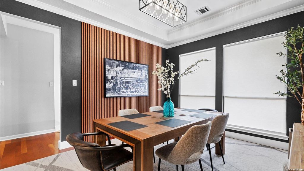 Located in the gated Blanco Bluffs community, this impressive residence offers a spacious, thoughtfully designed layout with upscale finishes throughout. Step inside to soaring ceilings and rich Brazilian cherrywood floors that flow seamlessly through the main living areas, creating an elegant yet inviting atmosphere. The chef-inspired kitchen serves as the heart of the home, featuring quartz and quartzite countertops, an oversized Blanco sink, under-mount LED lighting, a gas cooktop with pot filler, and white cabinetry, perfectly designed for both everyday living and elevated entertaining. The private primary suite is a true retreat, highlighted by a fully renovated, spa-like bath with exceptional tile work and dual closets. A versatile study on the main level offers the flexibility to function as a guest suite or additional bedroom, with a full bath conveniently located just outside, ideal for multigenerational living or a private office. Throughout the home, all bathrooms feature el