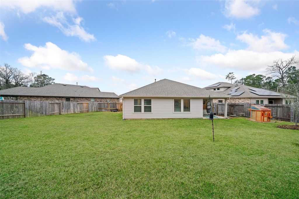 Lovely, 4 bedroom single-story home, near The Woodlands is situated on a huge culdesac lot. Solar panels for reduced electricity costs. The 3 year home features neutral colors throughout with large open spaces for entertaining. Beautiful kitchen is stocked with the essentials & features a large granite counter height breakfast bar & walk in pantry. The primary bedroom is furnished with a queen size bedroom set & a lovely bathroom with a large soaking tub, separate shower & large walk-in closet. The 3 secondary bedrooms are split off the main entry. One is currently furnished with a bedroom set, one is currently furnished as a home office & one is empty. The backyard features a covered patio & a lovely view of the woods behind the home. The home is conveniently within walking distance of Carl Barton Park & its playground, hiking trails & pickleball/tennis/basketball courts. Conveniently located 4 miles off of 45 and a great 15 min access to The Woodlands amenities.