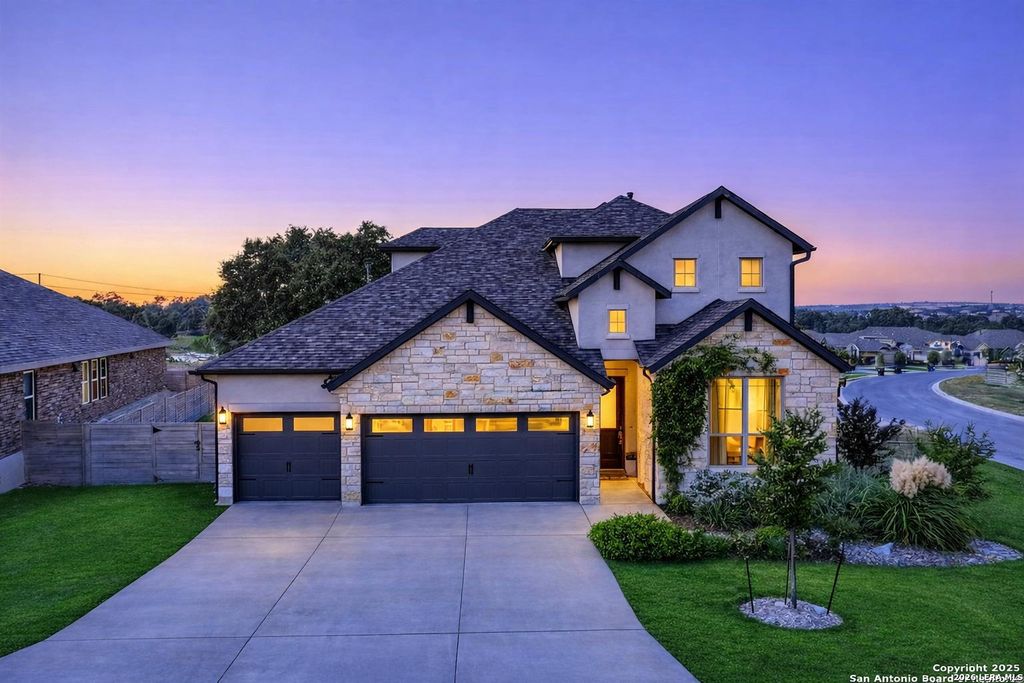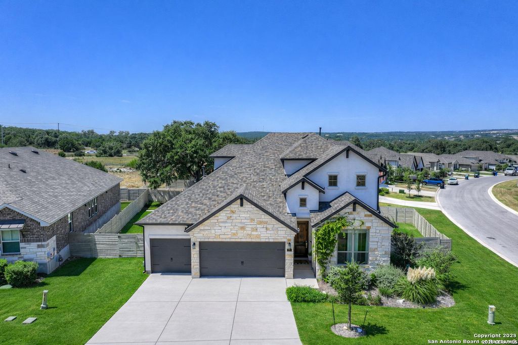 Welcome home to this lovely two-story home built by Monticello Custom Homes, offering 4 bedrooms, 2.5 bathrooms, and exceptional craftsmanship throughout. Situated on a desirable corner lot in the highly sought-after Vintage Oaks community, this residence blends Hill Country charm with modern luxury. Inside, the home features an open-concept floor plan with seamless flow for both entertaining and everyday living. The chef's kitchen includes a gas cooktop, farmhouse sink, built-in range and microwave, custom woodwork, and ample storage, while the adjoining dining space creates a perfect gathering spot for family and friends. The spacious primary suite is a true retreat, complete with a garden tub, dual vanities, and a generous walk-in closet. Additional highlights include a private office and an upstairs family room. The outdoor living spaces are equally impressive; A covered patio, privacy fence, and custom-built entertaining area make this backyard ideal for hosting. Four raised plant