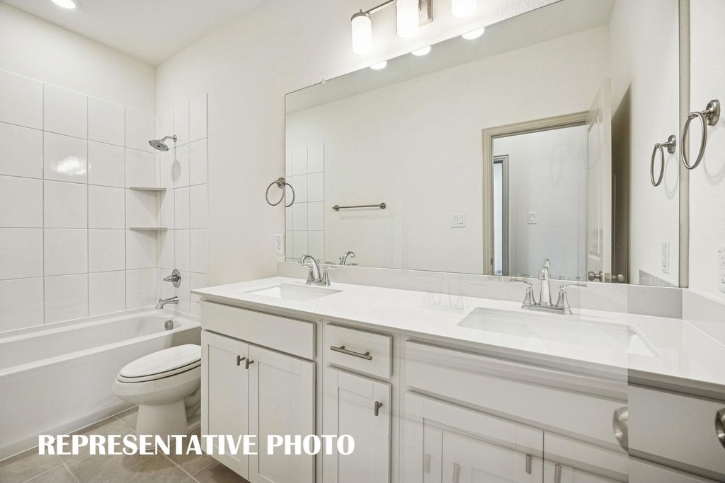 CB JENI HOMES EVA floor plan. This beautifully designed EVA floor plan offers 3 bedrooms, 2.5 baths, and a highly desirable downstairs primary suite. The home features a dramatic vaulted ceiling in the living room, creating an open, airy atmosphere filled with natural light throughout. The main level showcases elegant hard-surface flooring, an expansive living area, and a gourmet kitchen ideal for both everyday living and entertaining. The kitchen is appointed with an oversized island, sleek quartz countertops, stainless steel appliances, a gas range, and exterior venting. The spacious primary suite on the main level provides a private retreat, complete with an elegant ensuite bathroom featuring dual vanities, a large walk-in shower, and an oversized walk-in closet. Upstairs, you’ll find a generous game room, two well-appointed guest bedrooms—each with walk-in closets—and a large shared bathroom with double vanities. Abundant storage is thoughtfully incorporated throughout the home. Step outside to enjoy the fenced backyard with an oversized patio, perfect for outdoor entertaining or relaxing. With numerous upgrades and design features throughout, this home offers exceptional comfort, style, and functionality. MOVE IN READY NOW!