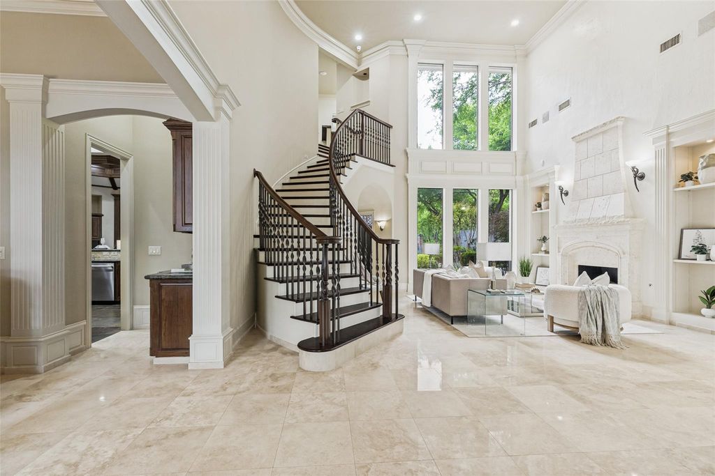 Tucked away on a quiet cul-de-sac in highly sought-after Shoal Creek, this exceptional home sits on a rare pie-shaped lot surrounded by mature trees and lush landscaping, offering both privacy and a true backyard retreat. The serene outdoor oasis features a sparkling pool and spa, along with a covered patio perfect for year-round entertaining. Inside, you’re welcomed by soaring ceilings, elegant formal living and dining spaces, and a light-filled layout designed for both everyday living and hosting. The chef’s kitchen boasts a large island, gas cooktop, built-in Sub-Zero refrigerator, and a butler's pantry. It opens seamlessly to the spacious family room with tranquil views of the backyard. Thoughtfully designed, the home offers generously sized bedrooms, each with its own en-suite bath. A stunning two-story office with custom built-ins provides the perfect work-from-home setting. The primary suite is a private retreat featuring vaulted ceilings and a spa-like bath with separate vanities. Dual staircases lead to the second floor, where you’ll find a media room, expansive game room with a walk-in wet bar, balcony access, and three additional oversized bedrooms. This home offers a 3 car garage with motor court, plenty of storage, is near walking trails, has quick access to DNT, and is close to dining and shopping. It is a rare find.
