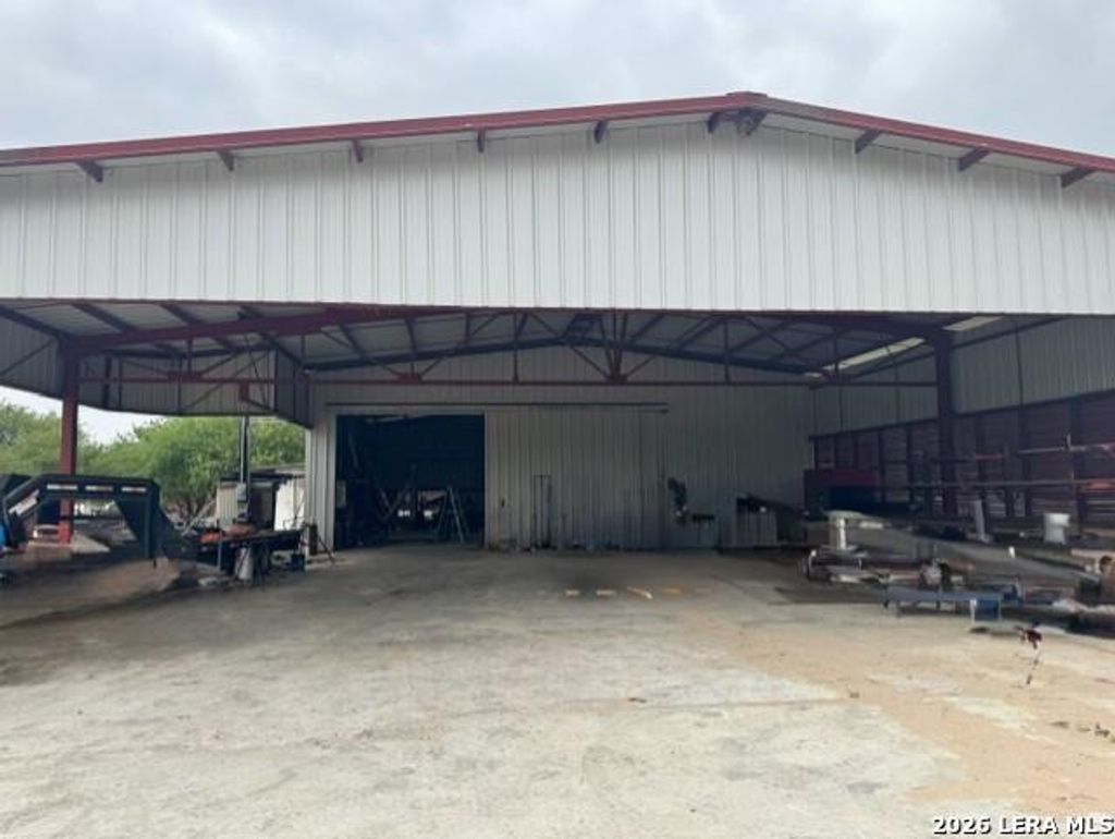 Country living at its finest! Great location and beautiful mature trees. There is a huge cement pond with solar lighting and a bridge that crosses over the pond for fishing or swimming located on the property. There are several metal sheds, barns and pens located on the property for storage or raising farm animals. No restrictions or city taxes. Home is in metal barn 1/1 with a kitchen/living room combined. There is a 3/2 slab already in place to build your dream home. Property has piped entrance with electric gate, piped fence front and side of property. One side has privacy fence. Metal shop, 66x120 located at front of property as you enter. Another 1b/1b located on side of shop. All this located on 5.54acres.