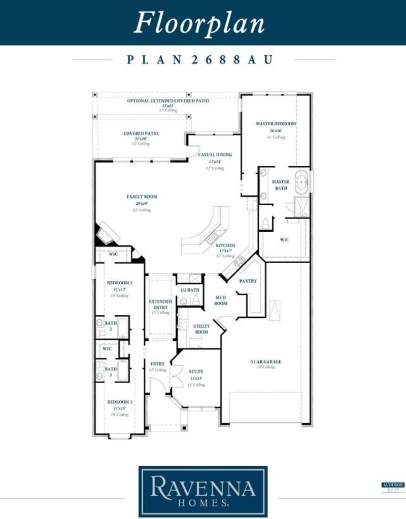 1-story home features large entry with 12' ceilings that extend past open dining room with 12' ceilings and leads to the family room with 12' ceilings, corner fireplace, and full wall of windows. Open kitchen overlooks the large family room and breakfast room, and features 42" cabinets, high-bar seating, and an oversized island. Master bath includes a freestanding tub, separate shower, and His & Hers vanities. Home is complete with an oversized 33' wide covered patio that overlooks a spacious backyard.