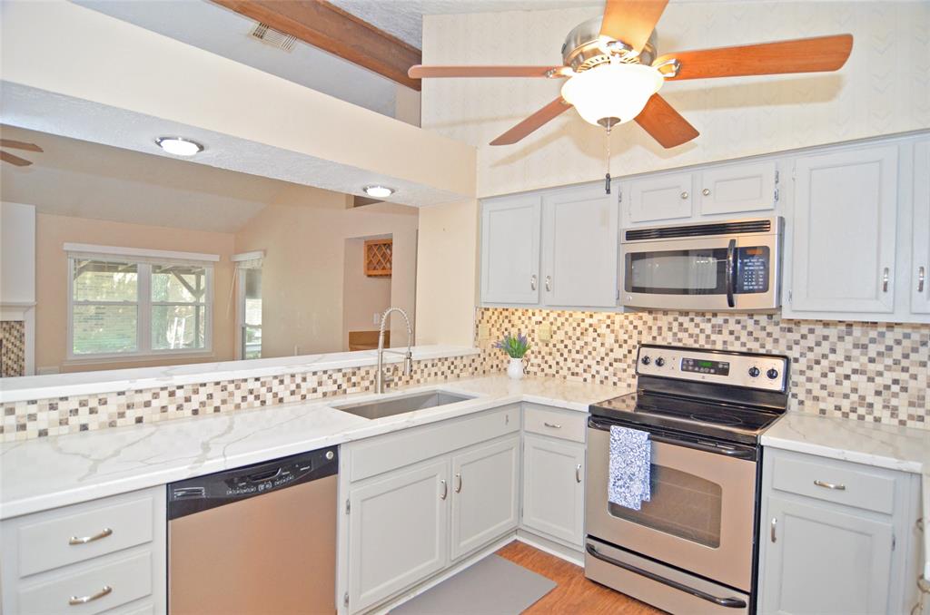 Charming patio home in the highly sought-after University Green subdivision. This 2-bedroom, 2-bathroom home features an open-concept layout with a spacious living room, cozy fireplace, wet bar, and a dedicated study. The beautifully updated kitchen offers marble countertops, stainless steel appliances, a large farmhouse sink, and a bright breakfast area that flows into the dining space. Newer windows throughout the home provide energy efficiency and plenty of natural light. Step outside to a generously sized backyard—perfect for outdoor gatherings, gardening, or simply unwinding in your own private space. Ideally located in the heart of Clear Lake—just minutes from parks, shopping, dining, and NASA. A wonderful blend of comfort and convenience in a prime location! Schedule a tour today!