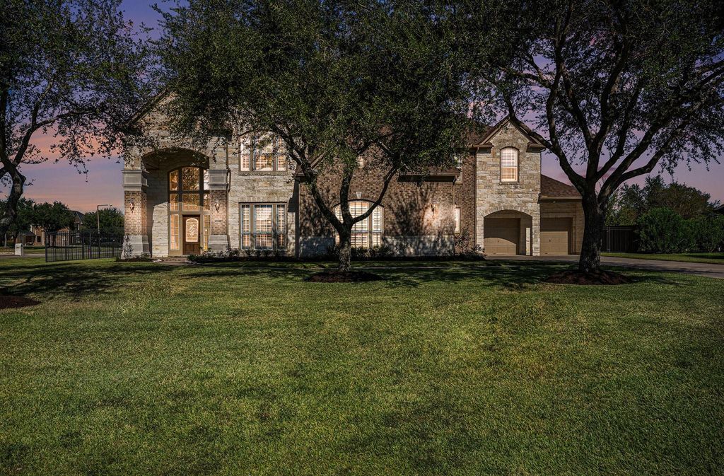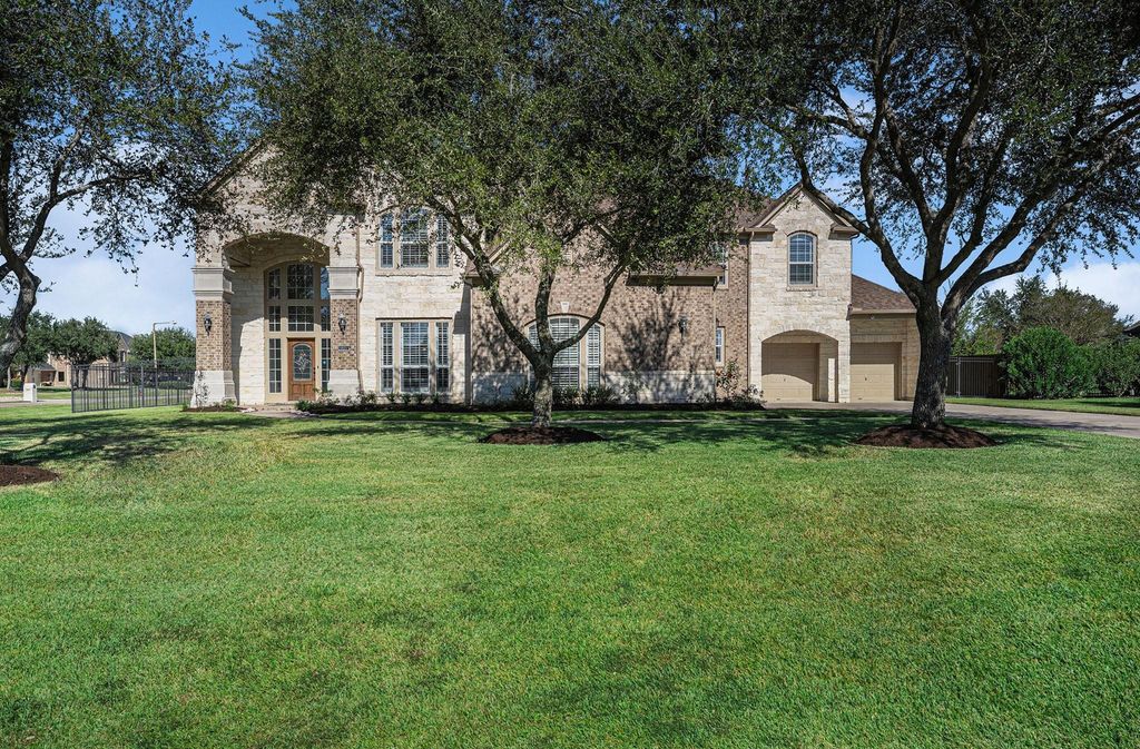 Welcome to this exquisite 6,870 sq ft single-family home nestled on a 1-acre corner lot in one of League City's most sought-after gated neighborhoods. Boasting 6 spacious bedrooms and 6 full bathrooms, this luxurious home has been renovated and is move-in ready. Step inside to find brand-new flooring, fresh paint throughout, and updated electrical switches and outlets, and plantation shutters. The heart of the home is the chef-inspired kitchen, featuring sparkling quartz countertops, a new gas range, and ample prep and storage space. This home offers exceptional flexibility with two full primary suites—perfect for multi-generational living—and a private guest suite. The remodeled first floor primary bathroom is a spa-like retreat with premium finishes and modern design touches. Additional highlights include 4-car garage, high ceilings, and plenty of options on the 2nd and 3rd floor for a media room and/or game room.