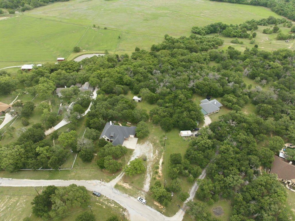 A gated drive leads to this inviting brick home, where a covered entry opens to a bright interior defined by warm wood flooring and thoughtful architectural details. The foyer is anchored by a statement chandelier and a pair of wood-framed glass doors, with an arched opening that draws you into the main living spaces. The main living area offers a comfortable, open layout with a stately fireplace and multiple sets of glass doors that bring in natural light and connect to the outdoors. A secondary living or sitting area provides additional flexibility, while the dining space is set just off the main room for easy flow. The kitchen features abundant storage in light cabinetry and bar seating with tasteful pendant lighting overhead. Stainless steel appliances, including a double oven, complement the clean design, while a tiled backsplash and ample counter space enhance functionality. The primary bedroom showcases wood flooring, a distinctive wood-beam ceiling, and room for a sitting area. The en suite bath includes a freestanding tub, a separate tiled shower, and a dual-sink vanity, along with a generously sized closet outfitted with built-in organization. Outdoors, a screened porch offers a relaxed setting with views of the surrounding greenery. The backyard includes a raised, terrace area overlooking the rest of the grounds, with wooden railings, a paver walkway, a fire-pit, and broad stairs leading down. Enjoy plentiful mature trees, a convenient metal outbuilding, and lots of room to relax and entertain, all fully fenced. Easy access to Hwy 199 and nearby spectacular Eagle Mountain Lake with fishing, boating, trails, parks, and more.