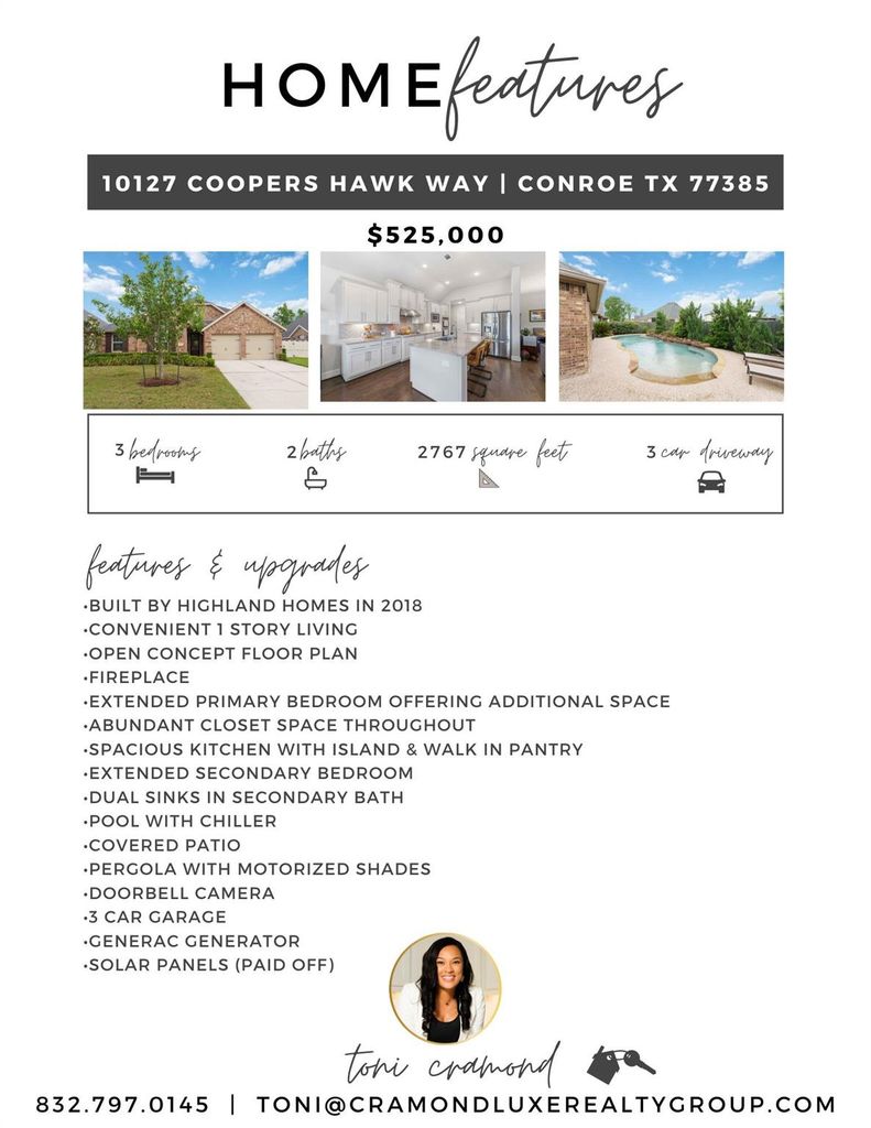 Welcome to this very well maintained 3 bed/2 bath home offering space, style, and functionality. The warm entryway invites you to the welcoming living room adorned w/lots of windows and a cozy fireplace. The chef's kitchen with a large walk in pantry, is spacious and ideal for cooking & gathering. The home office gives you the flexibility to work from home in style. The extended primary bedroom offers relaxing views of the backyard, & an en suite bath w/dual sinks. The secondary bedrooms are comfortable w/large walk-in closets. Beautiful wood-like flooring flows through the main living areas, adding warmth & durability. Enjoy the backyard retreat w/pool complete w/chiller, outdoor kitchen, & pergola w/motorized shades for year round enjoyment. The Generac generator offers peace of mind and the paid solar panels save you money. The 3 car garage for parking, storage & working. Conveniently located near I-45 and minutes from The Woodlands, top medical facilities, shopping, & dining.
