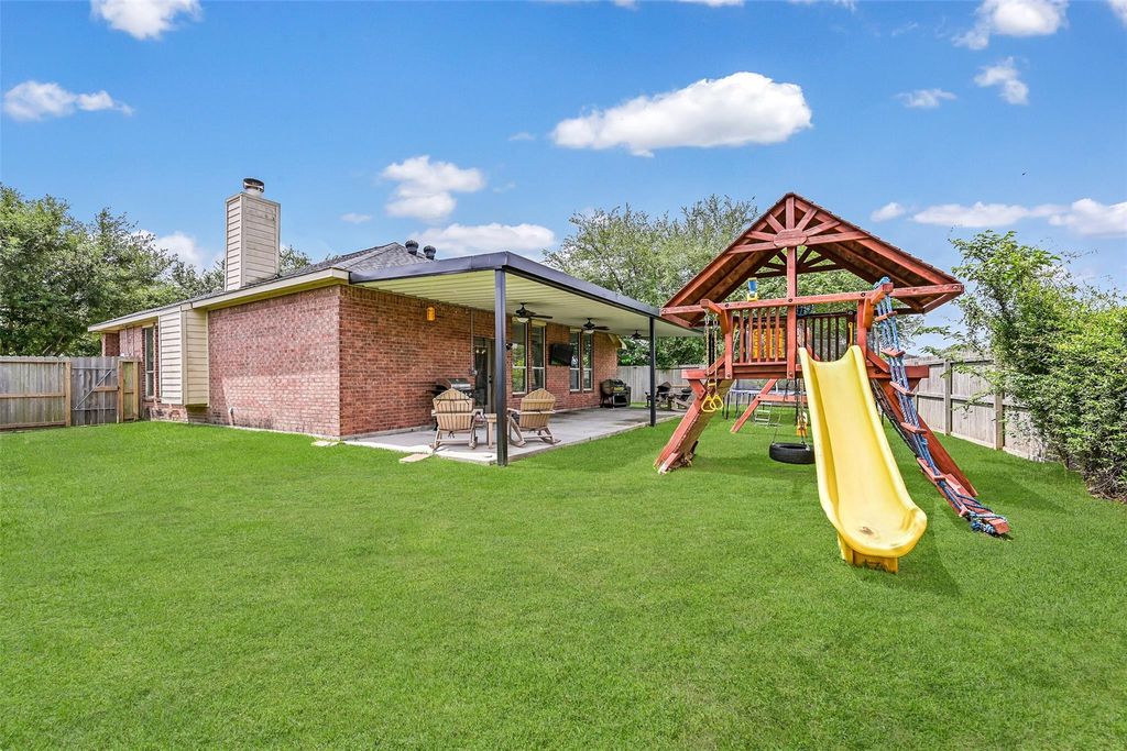 Single-story 3/4 bedroom, 2 bath home in The Meadows of Bay Colony in Dickinson ISD! This updated & well-kept home features 10' ceilings, neutral grey paint, & wood-look tile flooring throughout. The centrally located family room is anchored by a corner gas log fireplace with a herringbone marble tile surround and flows seamlessly into the island kitchen with granite countertops, breakfast bar seating, ebony cabinetry, a geometric tile backsplash with under cabinet task lighting, a stainless gas cooktop & convection oven, & a roomy corner pantry. The split floorplan boasts a private primary suite with soaking tub & seamless glass shower, two secondary bedrooms with a gameroom between, plus a front bedroom or study option. Also note the tankless water heater, recent roof, & foundation warranty! Enjoy a covered patio that spans the back of the home & overlooks a low-maintenance yard with a playset & no rear neighbors. Bay Colony amenities include pools, trails, parks, & golf nearby.
