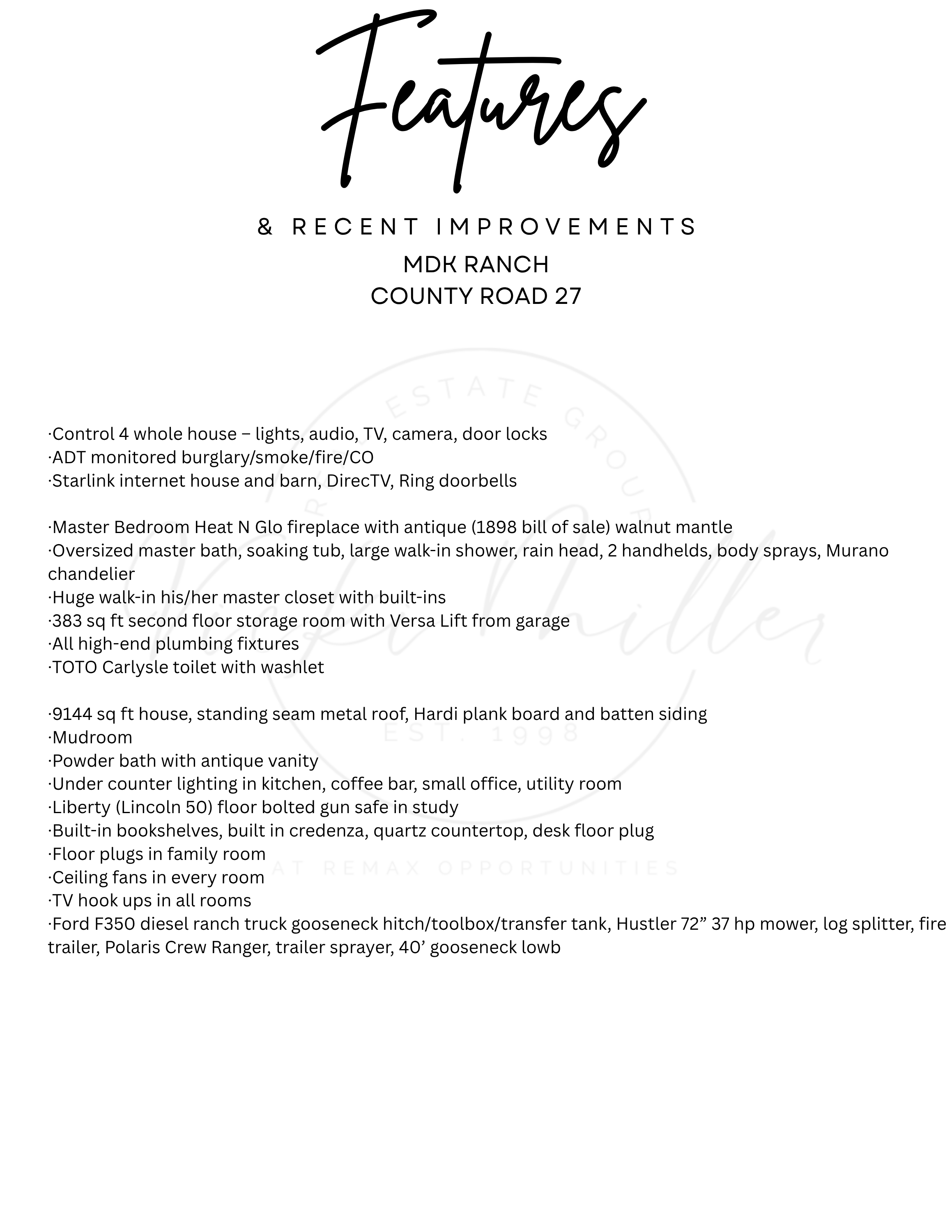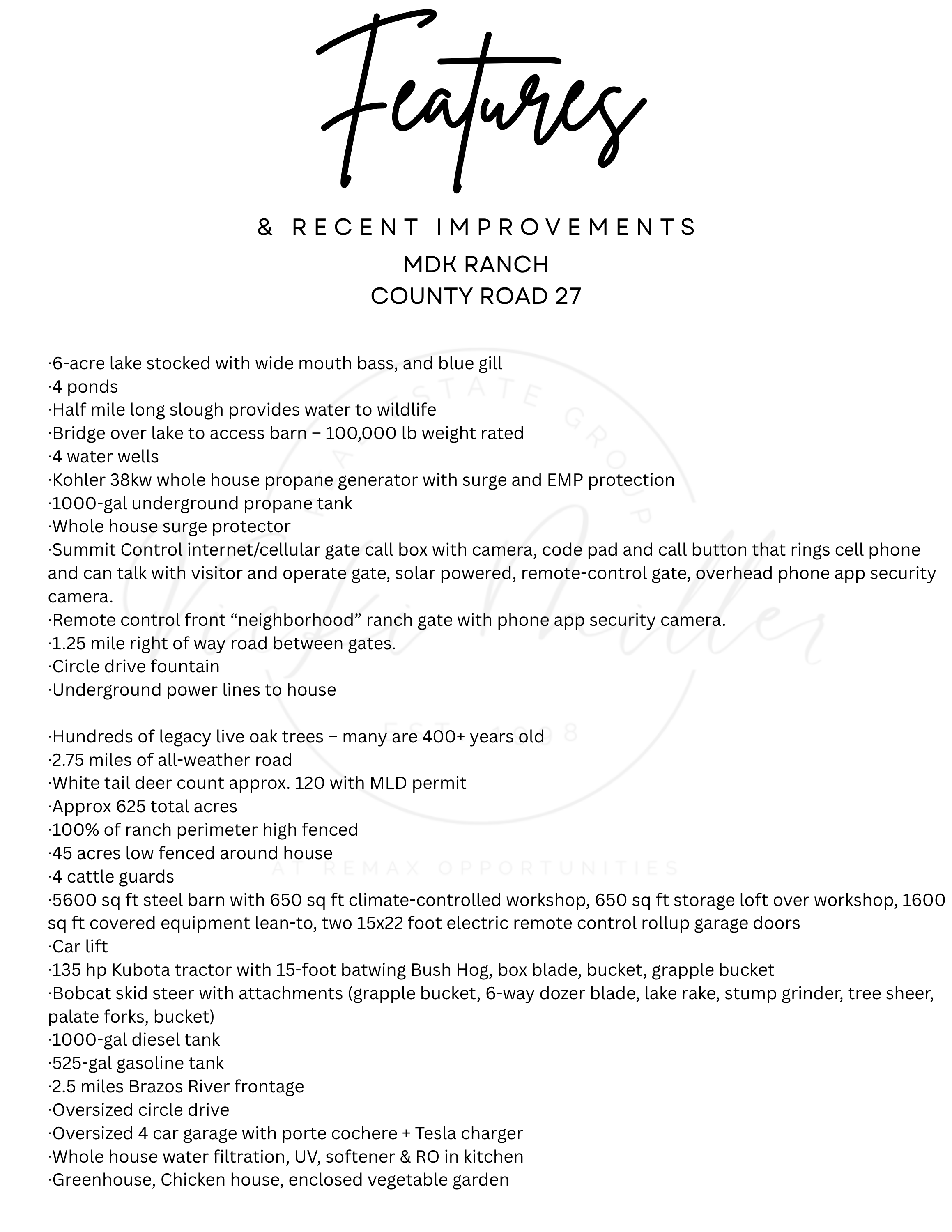 MDK Ranch is comprised of 621+ acres offering a rare blend of luxury, privacy, & natural beauty. 9,500± sqft custom home is designed for both grand entertaining & everyday living with expansive spaces, high end finishes, & seamless indoor/outdoor flow. The land showcases 2.5± miles of Brazos River frontage, a 6 acre stocked lake, 4 addl ponds, & abundant wildlife supported by high fencing & MLD permit. Mature live oaks & improved pastures create a breathtaking setting. The residence includes a chef’s kitchen w/Sub-Zero&Wolf appliances, oversized island, coffee bar, & a 1,400 bottle climate controlled wine room. Smart home automation, Starlink internet, & advanced security enhance convenience. Outdoor amenities feature a resort-style pool, spa, fire features, & full outdoor kitchen. Additional improvements include a 5,600 sqft workshop, multiple wells, generator, & extensive road system throughout. A rare offering of scale, beauty, & functionality; this is a true Legacy Ranch Estate!!