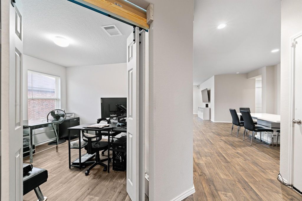 Welcome to Sunset Crossing! Come explore the stunning Lakeway floor plan, offering 2,041 sq. ft. of thoughtfully designed living space. This rare layout features 4 bedrooms, 3 full baths, and a dedicated home office/study, providing the perfect blend of comfort and functionality. Step inside and be greeted by beautiful, low-maintenance laminate flooring throughout the common areas, while plush carpeting adds warmth to all bedrooms. The spacious primary suite boasts a luxurious en-suite bath and a generously sized walk-in closet. Step outside to the expansive covered patio, perfect for outdoor gatherings. This home is also equipped with Smart Home technology, including smart lighting and a wireless security system for added convenience and peace of mind. Ideally located near Brazos Town Center with easy access to Highway 59, this home offers both convenience and charm.