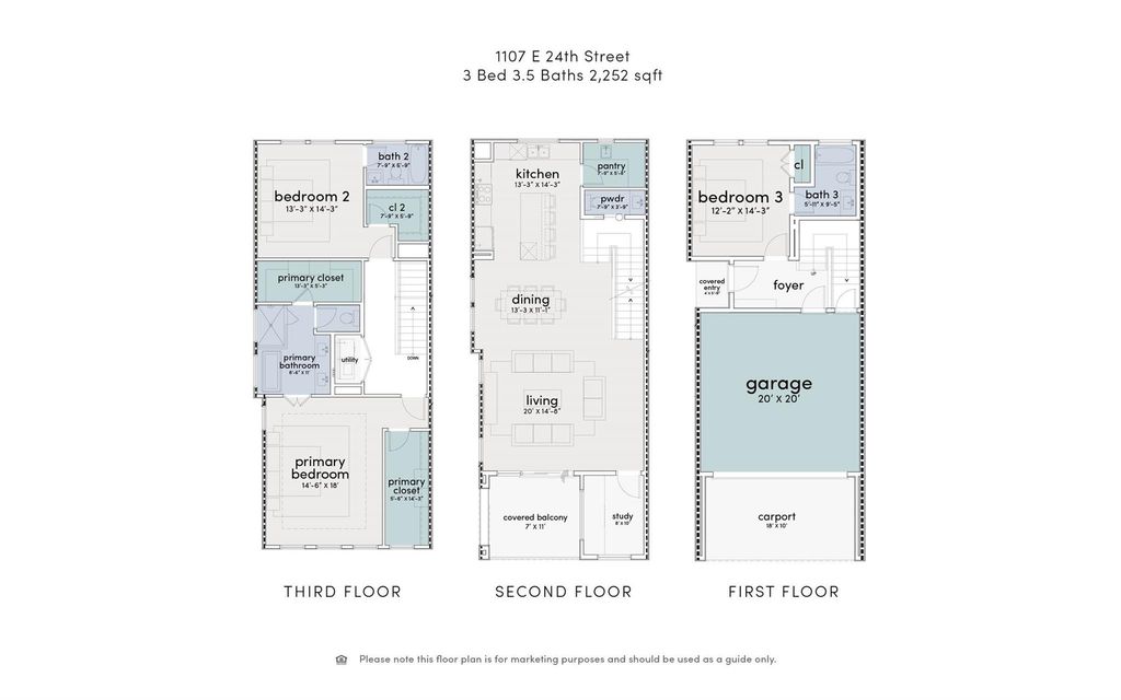 Beautifully crafted new construction in the Heights by TOMO Homes, offering 2,252 sq ft of thoughtfully designed living space. This 3-story home features 3 bedrooms, 3.5 baths and a highly functional layout tailored for modern living. The first floor includes a private guest suite, mudroom and attached 2-car garage. The second floor is the heart of the home with an open-concept living, dining and kitchen space, plus a covered balcony—ideal for entertaining. The gourmet kitchen showcases quartz countertops, white oak cabinetry and a walk-in pantry. The third floor features a spacious primary suite with a freestanding tub, fluted tile accents, dual vanities and generous sized His and Her closets, along with an additional bedroom, full bath, utility room and flex space. Elevated finishes throughout include brass fixtures, porcelain tile and curated selections that create a clean, modern aesthetic. Ideally located near Heights dining, trails and major corridors. Est. completion Summer 2026