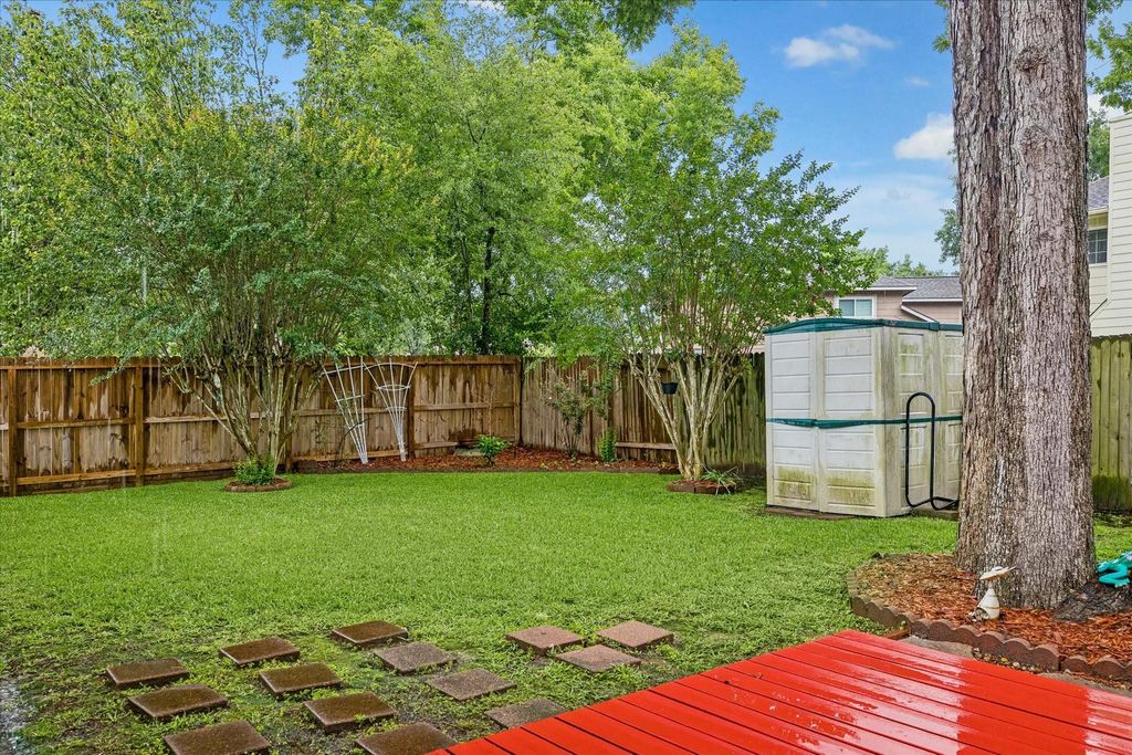Step into this beautifully cared-for 3-bedroom, 2.5-bath home situated on a charming lot. The interior features soaring ceilings, decorative lighting, and warm wood flooring that flows through the dining and living spaces. The private primary suite on the main floor provides a peaceful retreat, complete with solid-surface countertops, a separate shower, and a soothing jetted tub. The updated kitchen showcases granite countertops, modern cabinetry, and a stylish backsplash, making it both functional and inviting. Upstairs, you’ll find two additional bedrooms, a full bathroom, and a large game room pre-wired for sound—perfect for entertainment or relaxation. You will also find a bonus room perfect for an office. Outside, the oversized backyard offers a wood deck, new fencing, generous shade, and ample space for gatherings or outdoor fun. This home has remained high and dry and has never experienced flooding, per the seller.