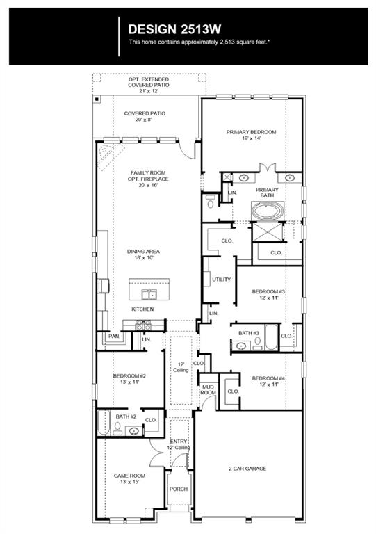 Extended entryway with 12-foot ceilings. Game room with French doors frame the entry. Spacious family room with a wall of windows. Open kitchen offers an island with built-in seating space and a corner walk-in pantry. Primary suite with a wall of windows. Dual vanities, garden tub, separate glass enclosed shower and two walk-in closets in the primary bath. Guest suite just off the extended entry with a full bathroom and walk-in closet. Secondary bedrooms with walk-in closets. Utility room with private access to the primary bathroom. Covered backyard patio. Mud room just off the two-car garage.