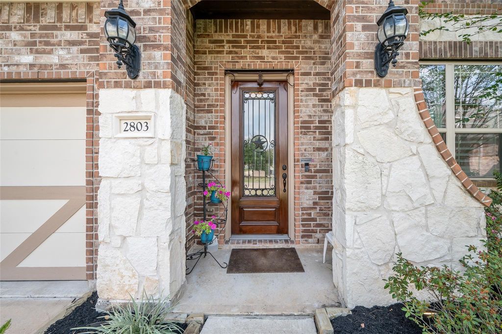 Stunning 5-bedroom, 3.5-bath home brimming with upgrades and timeless design. Inside, wood floors, plantation shutters, recessed lighting, and ceiling fans complement a dramatic two-story stone gas fireplace with convenient floor plugs. The chef’s kitchen impresses with stainless steel appliances, convection microwave, built-in range, under-cabinet lighting, and a hands-free faucet. Retreat to the primary suite with a sitting area, dual walk-in closets, soaking tub, walk-in shower with body jets, and a heated towel rack. Smart features include a tankless water heater, whole-house filtration, water softener, and epoxy garage flooring. Outdoor living shines with a large covered patio, arbor lighting, full kitchen with grill, sink, refrigerator, and fireplace, plus a 10x12 powered workshop. Brick accents wrap the exterior, creating curb appeal that blends elegance, efficiency, and resort-style comfort.