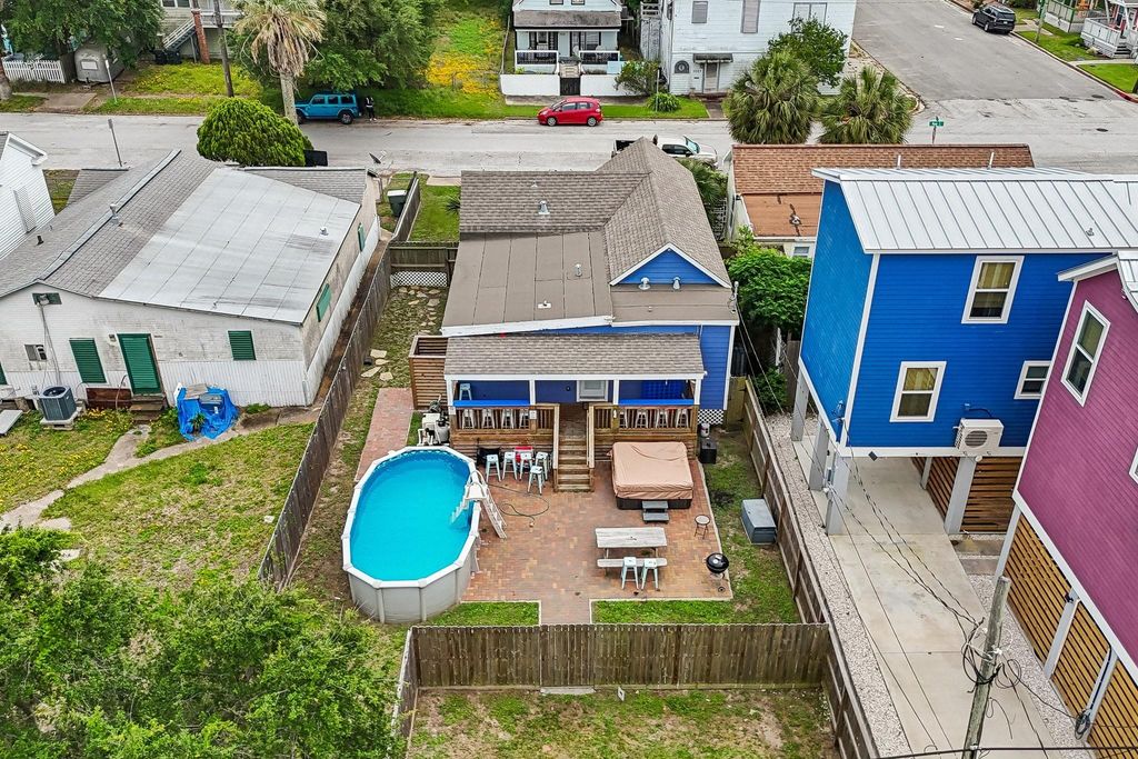 0.1 mi to Poretto Beach • Heated pool + hot tub • Active short-term rental 4BR/2BA single-story home in Galveston’s East End, approx. 0.1–0.2 mi to Poretto Beach. Currently operating as a top-performing short-term rental. Open kitchen with breakfast bar, updated Granite countertops, and direct flow to living area. All bedrooms on first floor with TVs in each room. Interior features include tile and vinyl plank flooring, washer, dryer, and refrigerator. Exterior includes heated pool, separate hot tub, outdoor shower, fenced backyard, and patio/deck space. Three off-street parking spaces. Balcony and covered porch. Custom Galveston mural by local artist sets a festive mood. Located near Broadway with access across the island. Suitable for full-time use, second home, or vacation rental operation.