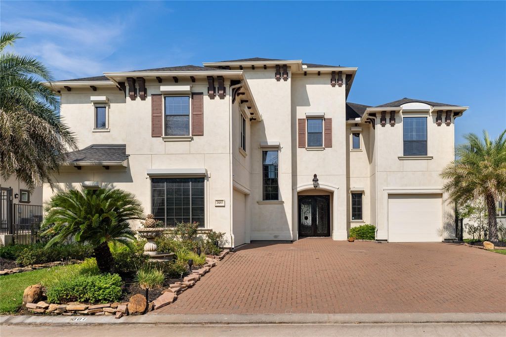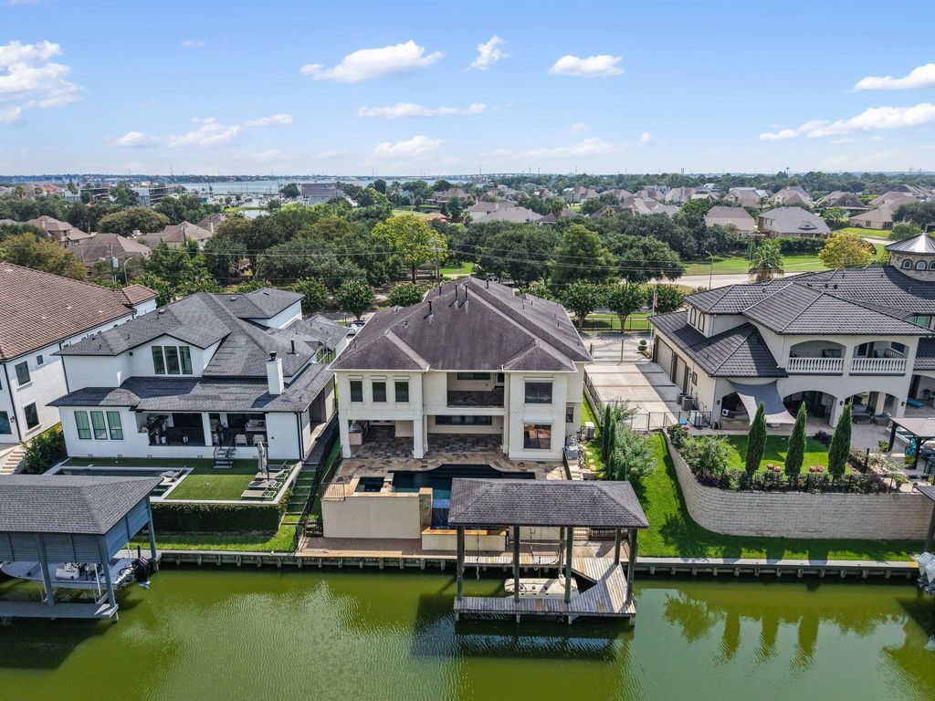 Experience waterfront living in this stunning 5-bedroom home featuring first floor living in a controlled access community. Standouts include a private elevator, full house generator and storm shutters to ensure convenience and comfort. The open design on the first floor includes the formal Living and Dining Rooms, Kitchen and Breakfast Rooms, Butler's Pantry, Wet Bar and a Study, covered patio, infinity edge pool and summer kitchen for seamless indoor-outdoor living. Enjoy a private boat slip on a canal opening to Clear Lake for endless water fun. Upstairs offers 5 bedrooms (including the Primary suite) with en suite or Hollywood baths, the Game Room and balcony with serene views and the Laundry Room. Custom tub/shower glass enclosures and striking custom glass exterior doors with wrought iron detailing are just a few of the design features that elevate the home's refined detail. Gated Marina del Sol offers peace of mind plus accessibility to restaurants and shopping opportunities.