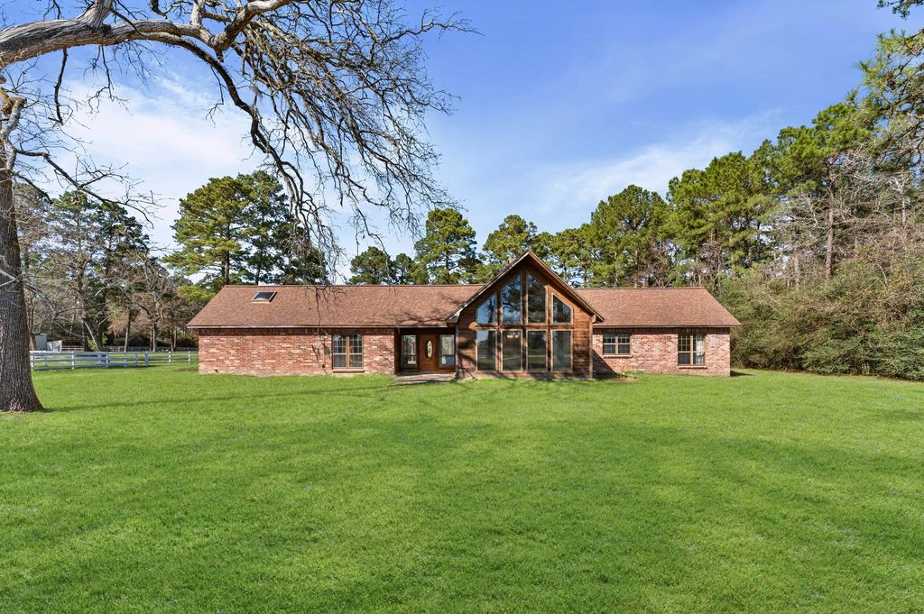 Spacious home on 2 unrestricted acres with no neighbors on the left and an open pasture across the street, offering privacy just a short drive to Hwy 249. Features 5 bedrooms, an optional flex space ideal for a nursery, study, or office. The living room offers soaring ceilings, wood beams, and large windows that fill the space with natural light, anchored by a brick fireplace. The kitchen includes a large island with a cooktop, abundant cabinetry, a spacious pantry, and a window shelf perfect for plants or herbs. Built-ins and multiple closets provide excellent storage throughout. The primary suite features 3 closets, a large ensuite bath, and a skylight. Two secondary bedrooms share a Jack-and-Jill bath with private vanities and lavatories. An additional full bath is located nearby. An unfinished 484 sq ft space above the garage offers endless potential. The home needs some TLC, but is easily livable, presenting a great opportunity to update at your own pace. sold as is