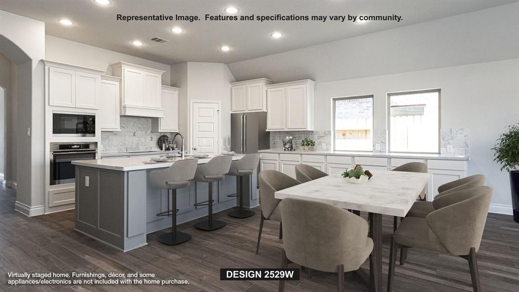 Home office with French doors set at entry with 12-foot ceiling. Open kitchen features generous counter space, a 5-burner gas cooktop, walk-in pantry, and island with built-in seating space. Dining area flows into open family room with wall of windows. Primary suite includes bedroom with wall of windows. Dual vanities, corner freestanding tub, separate glass-enclosed shower and two walk-in closets in primary bath. A guest suite with private bath adds to this four-bedroom design. Extended covered backyard patio. Mud room off two-car garage.