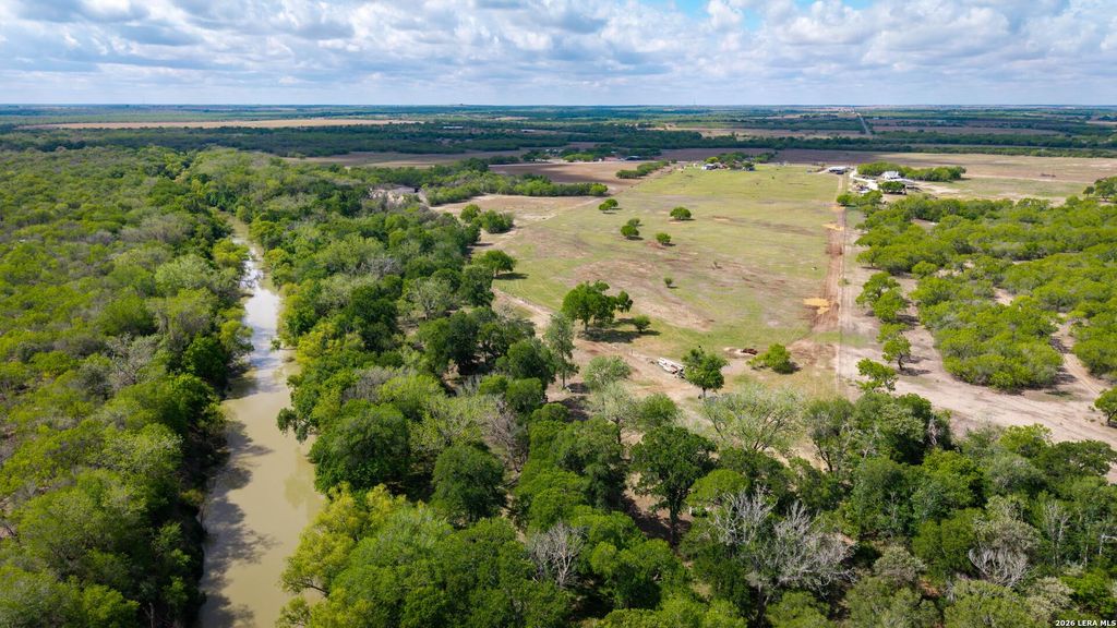 Experience the perfect blend of luxury living and wide-open Texas land with this exceptional 33.84+/- acre estate along the scenic San Antonio River. This remarkable property offers a stunning 4,297+/- sqft custom home, complemented by a 304+/- sqft casita with a bedroom and full bath, a 1700+/- sqft metal workshop featuring a one-bedroom, one-bath apartment, and an impressive 4,368+/- sqft metal barn. The custom home is truly the centerpiece, designed with both comfort and entertaining in mind. It features two spacious primary bedrooms with private ensuites, and a third bedroom. The open-concept layout seamlessly connects the large great room, dining area, and a gourmet island kitchen, creating a warm and inviting atmosphere filled with natural light. A den with a full bath, a dedicated laundry room, and an upstairs large multipurpose/game room complete with a wet bar and full bathroom provide flexibility for everyday living and entertaining. The downstairs primary suite offers two wa