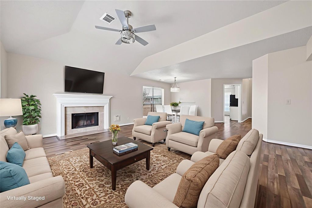 Spacious 4-bedroom, 2.5-bath home located in a quiet, established neighborhood. This well-maintained property features a functional floor plan w/generous living areas & abundant natural light throughout. Recent updates include NEW carpet/paint and AC 2019! You'll love the 2 story foyer entrance. The kitchen has bright white cabinets, granite counters & FRIDGE INCLUDED & opens to the main living and dining areas. Spacious family room with hard surface flooring and cozy gas fireplace. All four bedrooms w/NEW CARPET are upstairs & well-sized, providing comfort and flexibility for a variety of needs. The primary suite is spacious & has double sinks, separate tub & stand up shower and MASSIVE closets! The second floor game room has endless opportunities. The backyard offers plenty of space for outdoor enjoyment or future customization. Neighborhood amenities include a swimming pool, clubhouse, tennis courts, volleyball court & playground.