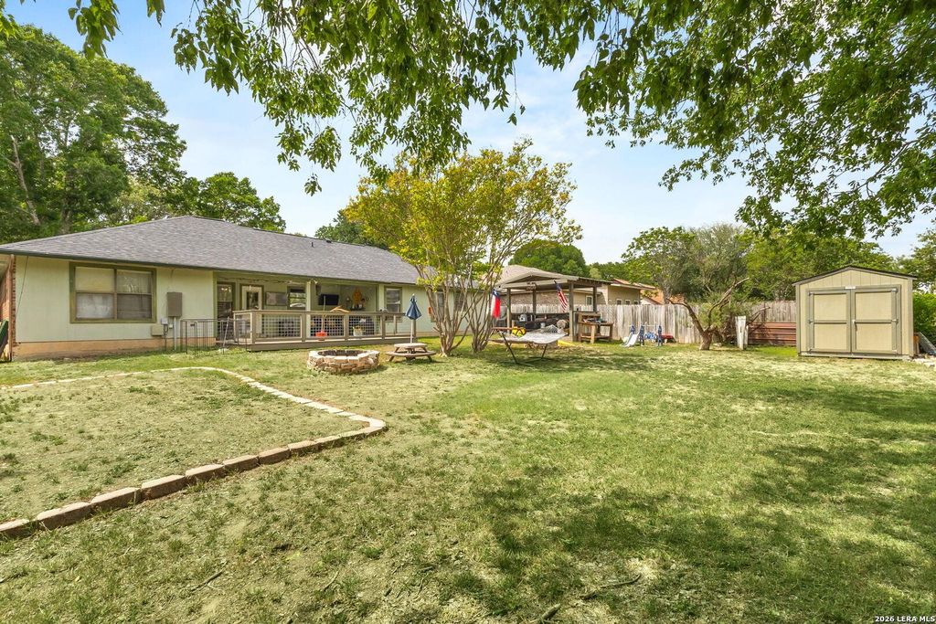 Welcome to this charming 3-bedroom, 2-bath home ideally located close to town and near the Guadalupe river-without the worry of being in the floodplain. You'll love the beautiful high ceilings, crown molding and functional split floorplan that offers both openness and privacy. The spacious primary suite features an oversized bedroom, his-and-hers walk-in closets, and a nicely updated walk-in shower. Step outside to a large backyard perfect for relaxing or entertaining, complete with a covered BBQ station and a cozy back porch. With a newer AC and roof already in place, this home offers comfort, convenience, and peace of mind. Don't miss it!