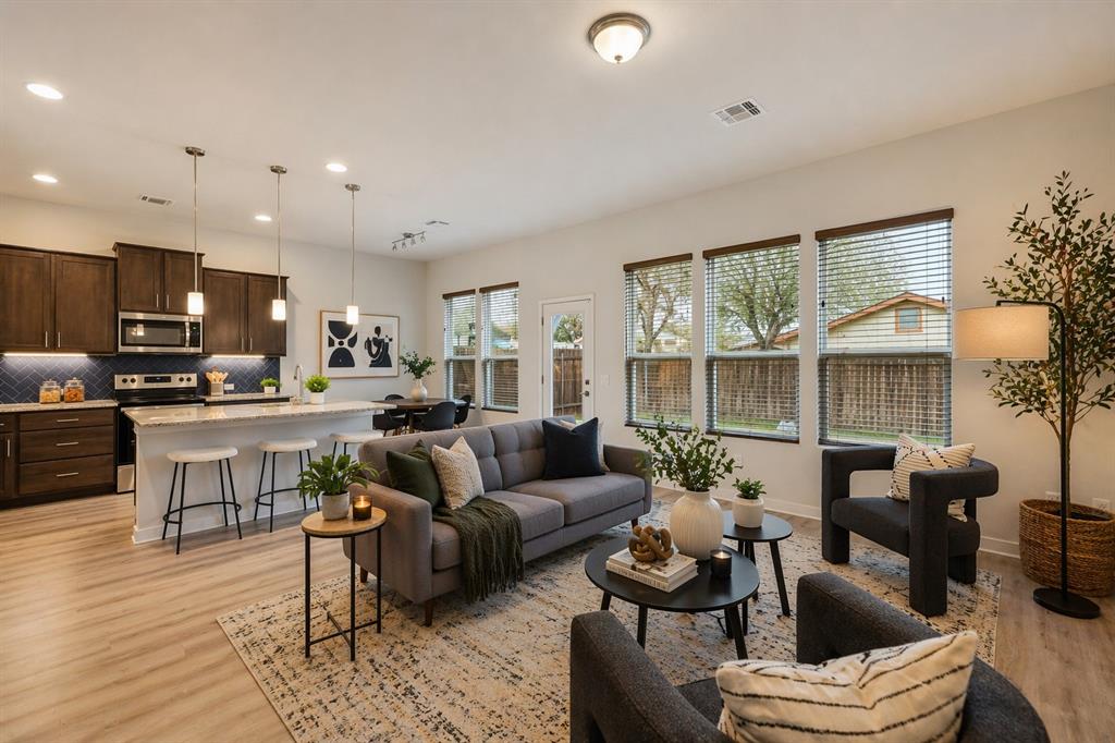 Modern, lock-and-leave 3/2.5 free-standing condo with upgrades throughout — the only one currently available of its kind in this charming gated community. Highlights include upgraded laminate wood flooring throughout (no carpet), an open living/kitchen/dining space with soaring ceilings and a wall of windows that floods the home with natural light. The stylish, functional kitchen features quartz countertops, rich cabinetry, a bold tile backsplash and an oversized island perfect for entertaining. The owner selected many of the developer’s premium upgrades, giving this home a more elevated, modern finish than others in the neighborhood. The spacious primary suite offers a double vanity and walk-in shower with upgraded finishes. Secondary bedrooms provide flexibility for guests, office space or both. Private backyard ready for your personal touch, plus a convenient attached garage with EV charger. Front yard maintenance is covered by the HOA — perfect for a low-maintenance lifestyle. Located just minutes from HEB, shopping, restaurants and major highways, with easy access to Downtown Austin, the airport and major employers such as Samsung — ideal for owner occupants, investors or anyone on the go.