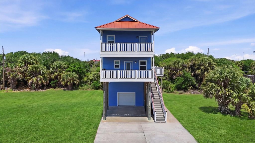This FULLY FURNISHED home with custom finishes, is your next island getaway! This low-maintenance home features fiber cement siding, impact-resistant windows, and a long-lasting metal roof. The home offers 3 bedrooms and 3 baths, each with a walk-out balcony. Enjoy a massive 500+ sq ft deck on the main level, perfect for entertaining family and friends! The nicely appointed kitchen showcases stone countertops, glass tile backsplash, and stainless steel appliances. Beautiful stained pine plank flooring throughout. This outstanding home is a short distance from the beach, Waterman's Restaurant, and Galveston State Park.