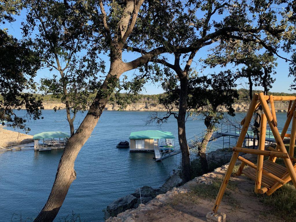 Lake Travis Waterfront 3.70 acre lot on very deep water main body of Lake facing huge Pace Bend Park for pristine view preservation with 115 ft shoreline. We had lake water throughout previous droughts..!! Excellent quality boat dock with air conditioned day cabin with galley. Dock has concrete symmetrical flooring, boat hoist and large jet ski lift, lake pump purification, incinerator toilet, storage closet, and kayak rack. 2nd galvanized landing and gangplank typically submerged and useful during low drought lake levels. Moderate slope to shoreline for easy access. Gated entry restricted development of large lots with low density and fine homes. Nice oak trees. Large lot suitable for home and accompanied guest house, studio, pool, large garage, workshop, sport court, man cave or she shed.