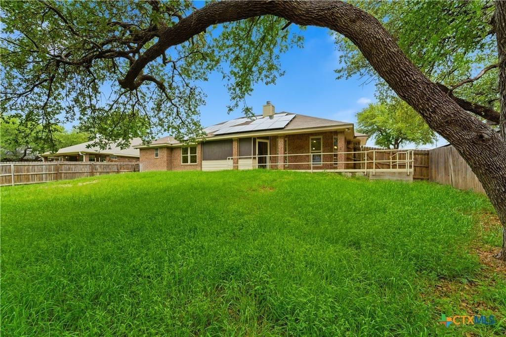 Beautifully updated 4-bedroom, 2-bath home in Killeen featuring an open-concept floor plan, high ceilings, and a floor-to-ceiling stone fireplace. Spacious living and dining areas with abundant natural light and oversized windows throughout. The kitchen offers ample cabinetry, built-in appliances, extensive counter space, and a large breakfast bar open to the main living area-ideal for entertaining. Private primary suite with tray ceiling, dual vanities, soaking tub, walk-in shower, and generous closet space. Split-bedroom layout with well-sized secondary bedrooms, perfect for guests, office, or flex space. Large backyard with mature trees, covered patio, and screened-in porch for outdoor living. Additional features include tile flooring throughout main areas, energy-efficient solar panels, and established landscaping. Conveniently located near Fort Hood, shopping, dining, and schools.
