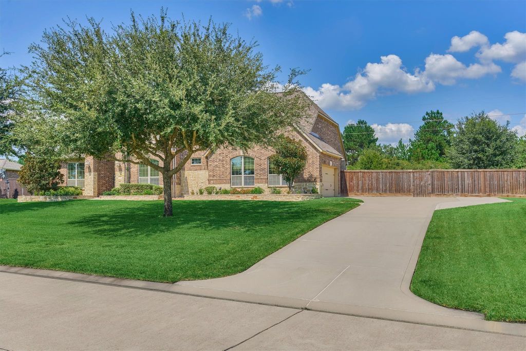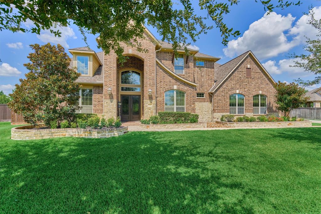 This elegant Trendmaker home sits on a half-acre lot in the sought-after Lakes of Fairhaven. The backyard is designed for resort-style living with a sparkling pool and spa, mini putting green, outdoor kitchen, and no back neighbors for added privacy. A brick and stone elevation with double-door entry sets the tone, leading inside to wood-look tile floors, soaring ceilings, and a bright, open layout. The study with French doors, formal dining room, and remodeled kitchen add to the home’s appeal. The kitchen boasts Taj Mahal quartz countertops, a built-in double refrigerator, wine fridge, and nugget ice maker, and opens to the family room and breakfast area. The floor plan offers two bedrooms downstairs, including a spacious primary suite with dual vanities, jetted tub, and walk-in shower. A secondary bedroom downstairs also features a private bath, while upstairs includes three additional bedrooms, a game room, and a media room.