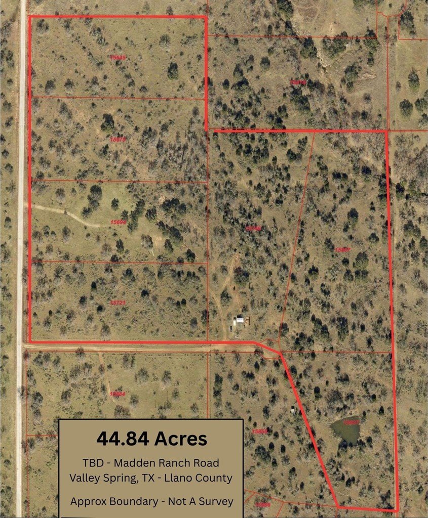 TBD -- Madden Ranch Rd is listed for sale at $ 799,000. This is a Country Homes/Acreage property. 0 square feet. The lot size is 44.8 Acres. ##BR##44.84 Acres in Llano County, Texas. Available now! Have you been dreaming of a Hill Country getaway to escape the daily grind? Perhaps you’’re looking for a picture-perfect place to build your forever home. This 44.84-acre property features rolling hills, gorgeous mature Oak and Elm trees, and stunning long-distance views in almost every direction. An earthen stock tank and a wet-weather creek add both beauty and character to the land, while numerous draws and thick native cover provide an exceptional habitat for local wildlife and hunting. For a comfortable retreat, the property includes a charming 288-square-foot cabin, perfect for resting after a day outdoors. It comes equipped with air conditioning, a full kitchen, a full bathroom, and a quaint country front porch with "views for days." The land is fully fenced with multiple entrances, and it has already been pre-divided into approximately five-acre tracts, offering excellent future investment flexibility. With electric, multiple water wells on-site and an active agricultural exemption for low taxes, this property is as practical as it is beautiful. Located on a paved county road approximately 25 minutes northwest of Llano and 90 minutes from both Austin and San Antonio, this versatile land is ideal as a recreational retreat, a hunting spot, or the site of your future dream home. This just might be the perfect place for you!