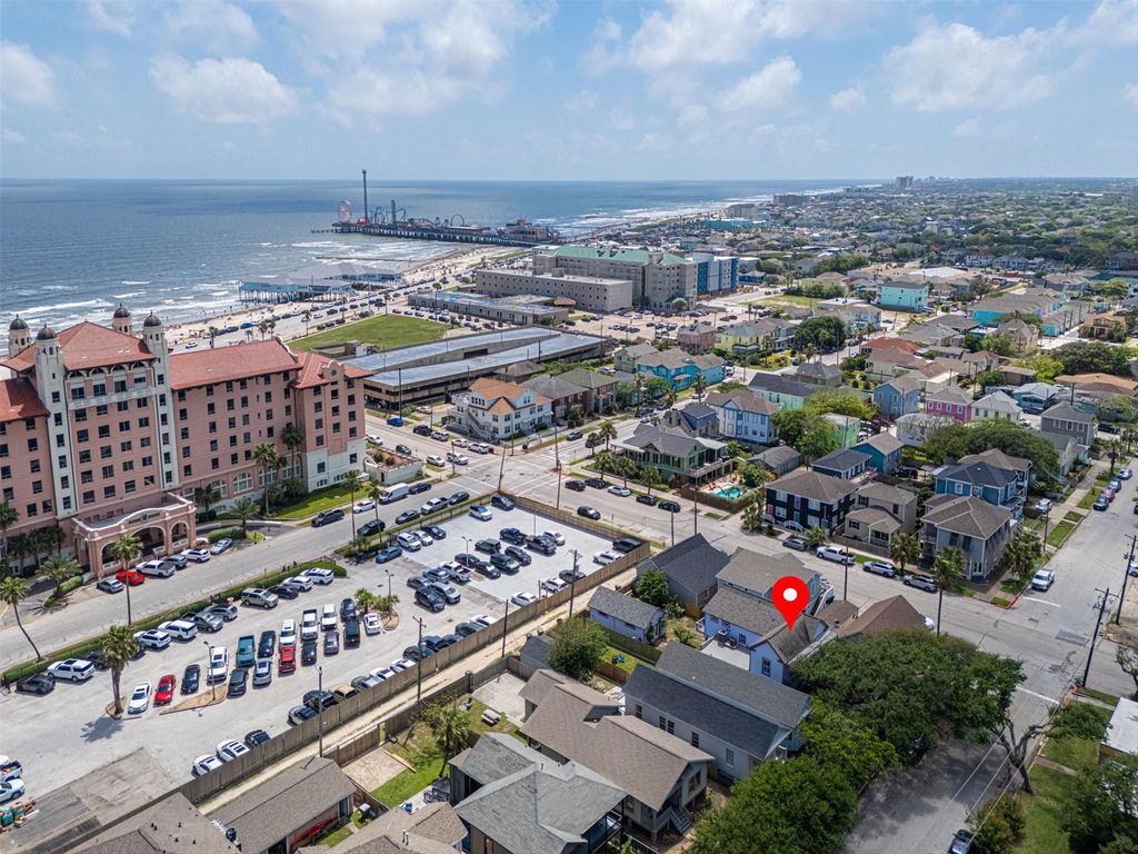 This historic 4 bedroom, 3 bath home from 1901, is just steps away from the Beach and the Grand Galvez. Features original heart pine floors, main floor primary bedroom with connecting bath. Second floor primary with luxurious bath and private balcony. The kitchen island counter with sink and dishwasher. Recently upgraded HVAC, plumbing, and electrical systems. There's a freestanding garage/workshop with heating and cooling. A gem in a prime location, offering a perfect blend of character and modern amenities.