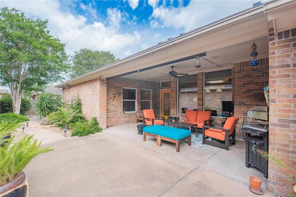 Beautiful open-concept garden/patio home with gated courtyard entrance in popular Kings Crossing subdivision. These highly desirable garden homes rarely come on the market! This well-maintained home features very large covered patio, visible from the kitchen and dining areas, providing an abundance of natural light and the perfect indoor/outdoor connection. Graceful archway over breakfast bar highlights the spacious living room. French doors at one end of the living room offer views of the open patio. Neutral paint tones pair perfectly with large tile flooring in the living, dining, kitchen, hallways, and baths. Crown moulding throughout most of the home. The gorgeous kitchen offers custom wood cabinetry, sleek granite countertops (including a breakfast bar for casual dining), a tile backsplash, Kitchen-aid double ovens, vent hood and large pantry with double doors. You''ll also appreciate the raised dishwasher for added convenience.The split-bedroom layout provides privacy, with the primary suite tucked off the living room. The spacious primary bath includes dual lavatories and a tiled walk-in shower with beach-entry design, glass block wall and window providing natural light. Large walk-in closet features double doors, built-ins, and great storage. Secondary bedrooms are located at the opposite end of the home near the roomy laundry area. Storage is abundant throughout. Outside, enjoy an easy-to-maintain yard with mature crepe myrtle trees and landscaping-ideal for gardening and giving pets room to roam. The oversized covered patio is perfect for morning coffee, evening cocktails, or entertaining. Additional patio off the living room is another great spot for enjoying a cozy fire pit or cool breezes. Windows have hurricane screens and French door has an electric storm shutter adding to the security. No need to board up for storms. Located near restaurants, shopping, movie theater and approx 20-minute drive to Padre Island beaches and the warm Gu
