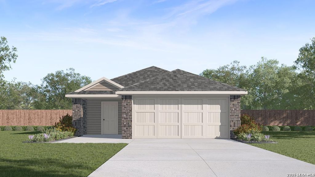 The Uma plan is our largest one-story home offered at Blue Ridge Ranch in San Antonio, TX. Featuring 2 classic front exteriors, 4 bedrooms, 2 baths, 2-car garage and 1544 square feet of living space, this floor plan will turn heads. Comfort greets you at the door with a long foyer leading to a combined living and dining area, then flowing into the grand kitchen. The kitchen includes a breakfast bar over looking the living and dining room with beautiful quartz counter tops, stainless steel appliances, shaker style cabinetry and a pantry with built-in shelving. Your blended family room and dining area feature quality sheet vinyl flooring and plenty of windows, creating a light and bright space for living and entertaining. The main bedroom is located at the back of the home and has its own attached bathroom that offers a separate water closet, tiled walk-in shower and spacious walk-in closet. All secondary bedrooms offer quality carpeted floors and a closet. These rooms are ver