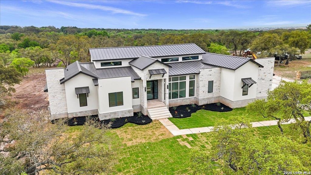 Modern Hill Country Estate | One-Story | Metal Roof | 1.5 Acres | Gated Located in prestigious Ridgeview Ranch, this Aurora Lux custom home offers 3,656 sq ft of elevated single-story living on a private 1.5-acre gated homesite. Designed with 4 bedrooms, 4.5 baths, a study, and a media/game room with bar, it blends refined design with everyday comfort. A grand pivot door opens to a dramatic living area featuring a statement coffered ceiling and expansive sliding glass doors that create seamless indoor-outdoor living. The covered patio with outdoor kitchen is ideal for entertaining. The chef's kitchen showcases an oversized island, premium Forno appliances, 48" gas range, butler's pantry, and striking two-tone cabinetry with warm wood accents. The private primary suite offers a stone feature wall, floating ceiling detail, fireplace, and a spa-like bath with dual vanities, walk-in shower, and freestanding tub. All secondary bedrooms include en-suite baths and walk-in close