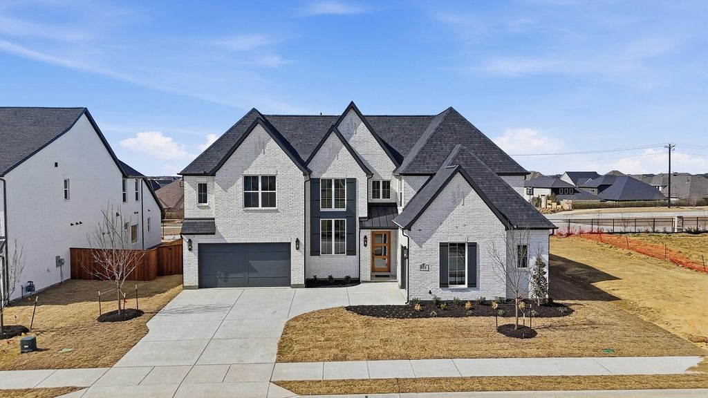 This home features a dramatic two-story entry with a gorgeous staircase, including a second platform landing at the raised study, along with double open railings overlooking the family room and kitchen and showcasing a vaulted ceiling that extends from the fireplace with tile to the ceiling all the way to the extended upper kitchen cabinets. Perfect for entertaining, the downstairs media room is wired and ready with a wet bar that opens to the family room and kitchen. The gourmet kitchen includes Calcutta Izaro quartz countertops, KitchenAid appliances, and extensive custom cabinetry at both the kitchen and wet bar with Soapstone Metropolis quartz countertops. The owner’s bath highlights a freestanding tub positioned in front of an oversized frameless shower and features separate vanities, his and her walk-in closets, and a large linen closet. This brand-new plan was designed as the model home for the subdivision and features a show-stopping two-story wall of windows along the rear elevation that opens to a 22-foot by 13-and-a-half-foot extended covered patio, creating an open and livable home design you are sure to love.