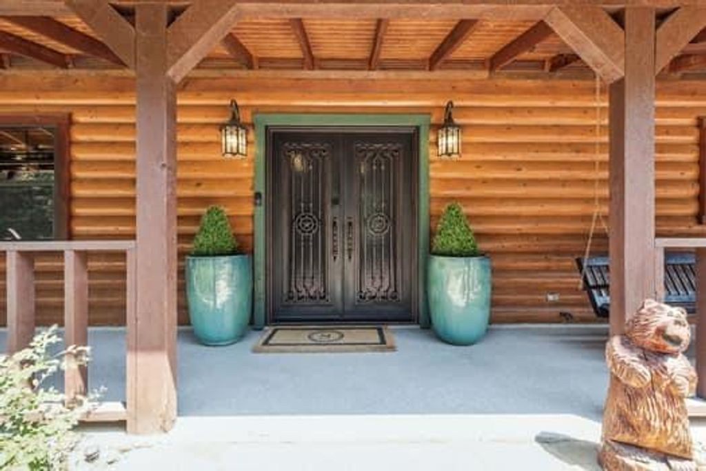 Every detail of its construction tells a story: the shell is crafted from exquisite blue pine sourced from Utah and Colorado, while the trim work is made of Western red cedar, and the staircase is fashioned from striking Ponderosa half logs. Inside, the home reveals an open-concept design, soaring ceilings, and expansive floor-to-ceiling windows that bathe the interiors in natural light. Beautifully crafted wood floors and ceilings, along with majestic stone fireplaces, add a sense of warmth and character to every room. PROOF OF FUNDS REQUIRED PRIOR TO SHOWING. The primary suite is a haven within itself, offering a cozy sitting area with a kiva-style fireplace, two walk-in closets, built-ins for added convenience, and private access to a home gym. Additionally, the suite opens to a loft space with limitless potential. Adding to the allure of this property is a separate 1,629 sqft apartment. Complete with a living room featuring a fireplace, a dining room, a fully equipped kitchen, a spacious bedroom, a full bathroom, and a powder room, this additional space offers versatility for guests or extended family. A 4-car garage with ample storage space further enhances the practicality of this home. This property is an extraordinary blend of natural beauty, thoughtful design, and unparalleled craftsmanship, inviting you to create your own retreat in a setting like no other