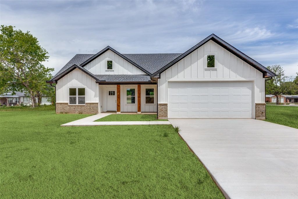 Welcome to this stunning new construction Modern Farmhouse! This thoughtfully designed 3-bedroom, 2-bath home offers an open-concept layout perfect for modern living. The chef-inspired kitchen features custom shaker cabinets, quartz countertops, subway tile backsplash, a large center island with pendant lighting, stainless sink with black pull-down faucet, and all black GE appliances including electric range, microwave, and dishwasher. A walk-through pantry provides generous storage. The spacious living room flows seamlessly into the dining area, ideal for entertaining. The primary suite boasts a tray ceiling with ceiling fan, walk-in closet, and private en-suite bath. Two additional bedrooms share a well-appointed full bath. The built-in mudroom with custom cabinetry and bench seating off the garage entry adds everyday functionality. Luxury vinyl plank flooring throughout main living areas with plush carpet in bedrooms. Attached 2-car garage. Board and batten siding with brick accents give this home standout curb appeal. Move-in ready!