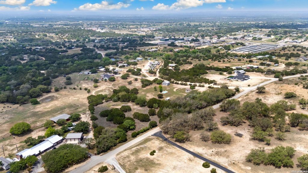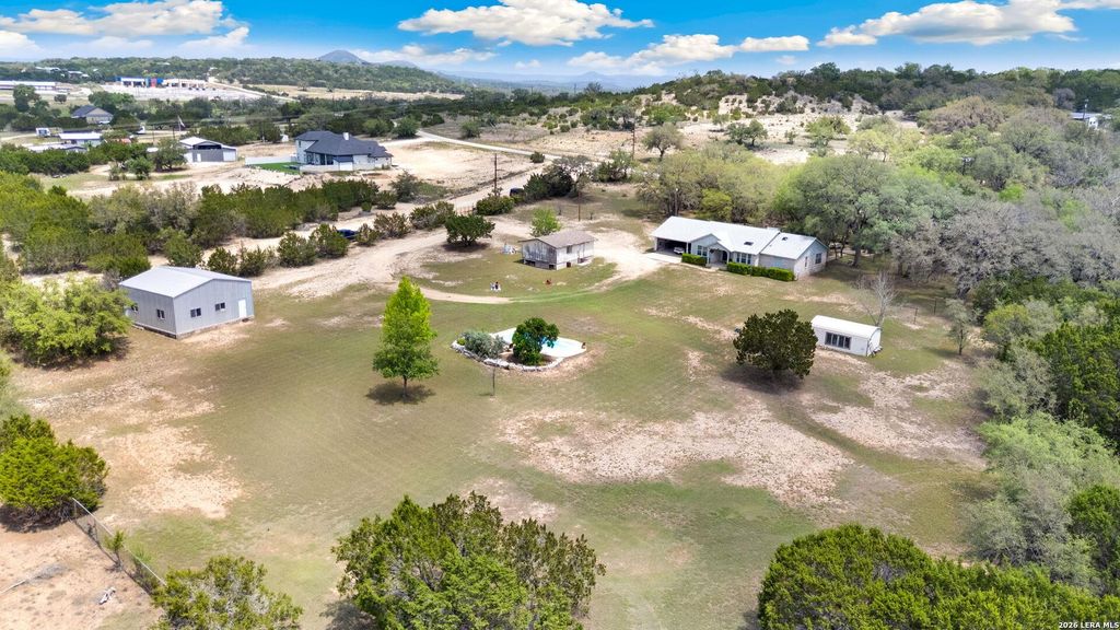 Welcome to this 3-bedroom, 2-bathroom single-story ranch-style home situated on 5.21 acres in the Wagon Creek subdivision in Bandera, Texas. This well-maintained property offers a functional split floor plan with an open-concept living and kitchen area filled with natural light from large windows and skylights. The living room features a wood-burning fireplace and opens to a fenced backyard with mature trees, patio space, and direct access from sliding glass doors. The kitchen includes an eat-in dining area with a scenic window view, and the laundry room is conveniently located just off the kitchen. The primary suite is positioned separately from the secondary bedrooms and includes a spacious bathroom with a skylight, walk-in shower, and walk-in closet. Additional features include ceramic tile flooring throughout the main living areas, an attached carport with storage, a workshop, and a greenhouse. The in-ground pool is west-facing, offering incredible sunset views overlooking the h