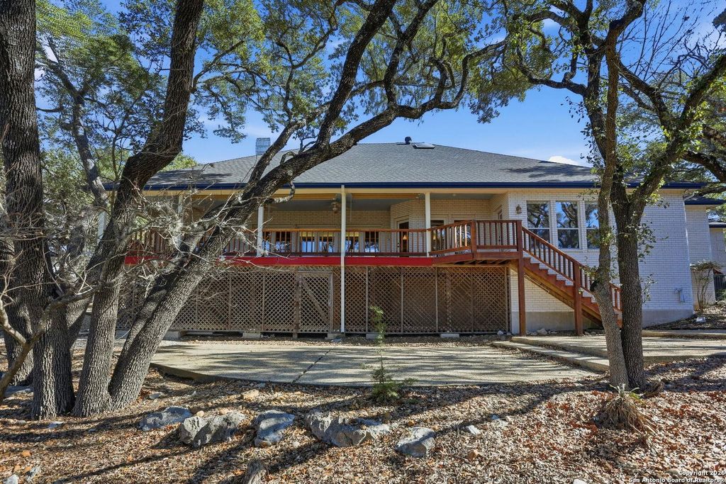 OPEN HOUSE 1/31 from 12-3 pm.!!Set on a quiet, desirable lot in Fair Oaks Ranch, this beautifully maintained single-story home offers 3,350 square feet of thoughtfully designed living space. The flexible floor plan features four bedrooms, three and a half baths, expansive living and dining areas, and an impressive four-car garage-ideal for both everyday living and entertaining. Rich Brazilian tigerwood flooring enhances the main living spaces and continues throughout all bedrooms and the dining room, complemented by a marble-tiled entry, plantation shutters, and abundant natural light. The luxury island kitchen is designed for both form and function, featuring granite countertops, double ovens, a Jenn-Air cooktop, a NEW smart message-board refrigerator, a Bosch dishwasher, and a trash compactor, seamlessly flowing into the living areas. A highlight of the home is the expansive 50' x 12' covered outdoor deck, perfectly positioned off the living room, dining area, and secondary bedroom