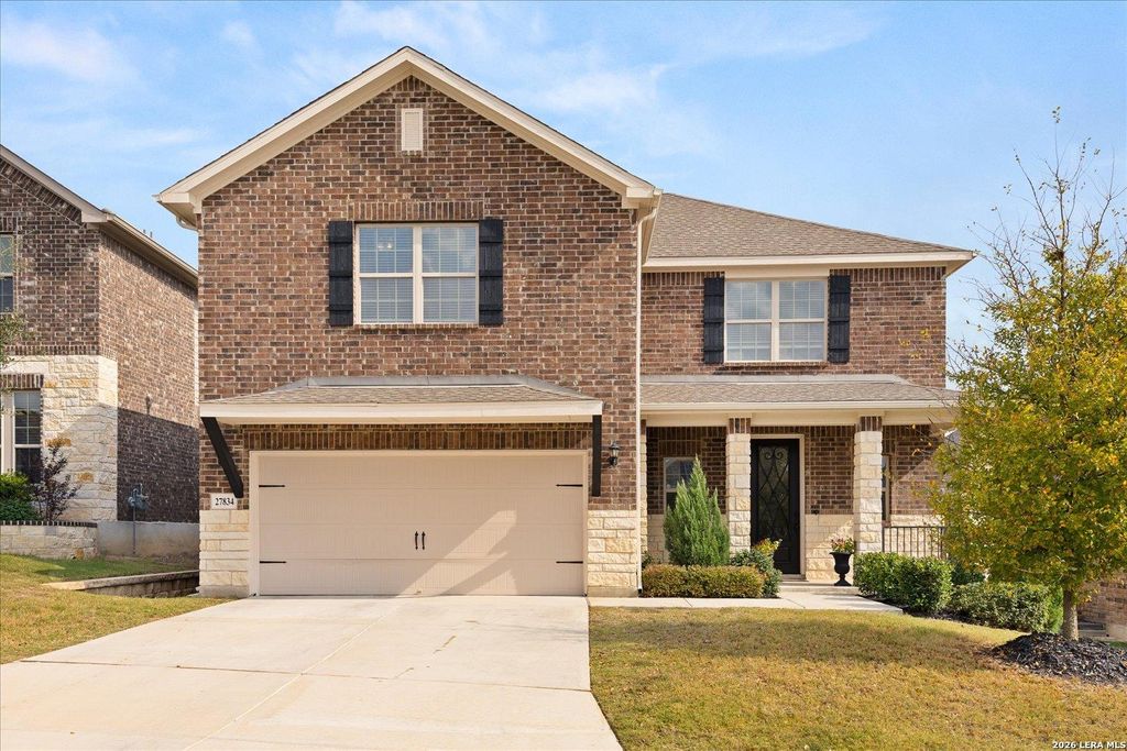 27834 Spanish Peaks is listed for sale at $ 479,000. The Single-Family property has 3 bedrooms, 2 Full Bathrooms, 1 Half Bathroom, 2173 square feet and was built in 2020. The lot size is 0 Square feet. ##BR##Views for miles from the back porch! Perched on one of the few greenbelt lots with unobstructed Hill Country views in this price range in the neighborhood, this stunning like new Ashton Woods home, built in 2020, offers breathtaking, long-range views of the Texas Hill Country and Camp Bullis and still has an actual backyard. It is on a greenbelt with no rear neighbors. This open floor plan has 3 bedrooms/2.5 baths that features a highly functional layout with the spacious primary suite conveniently located downstairs, while the additional bedrooms and a game room that could easily be turned into a 4th bedroom are tucked away upstairs. At the heart of the home, the kitchen shines with a gas cooktop and an oversized 8-foot island that’s perfect for gathering, meal prep, and entertaining. Some of the many upgrades include a reverse osmosis system, a new dishwasher, and a security system connected to the doorbell camera for added peace of mind. Step outside to an expansive covered back