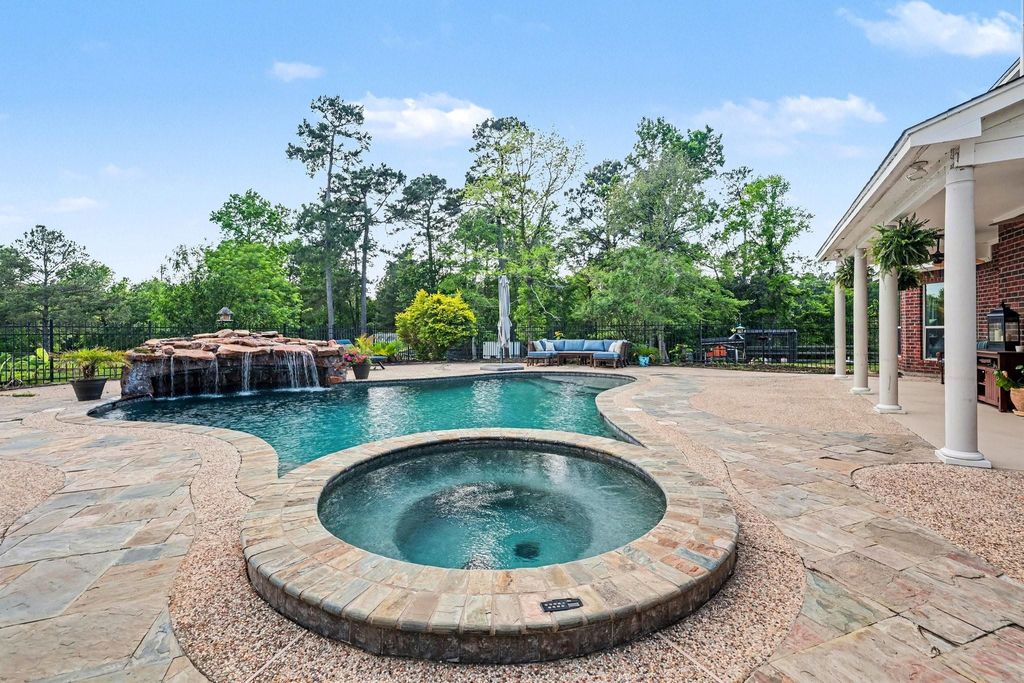 Country living meets modern convenience on nearly 4 acres in Montgomery Trace! This modern farmhouse is in a desirable area, minutes from Lake Conroe, The Woodlands and Woodforest. This neighborhood is one of the few that allows horses, chicken, livestock, in an HOA, retaining beautiful aesthetics. Southern charm greets you upon entering the covered front porch. Stepping inside, large windows invite an abundance of natural light, beautiful views of the sparkling pool, waterfall and the greenery of all the big trees and green pastures. The floor plan is functional for entertaining, with a lg dining room, family room, kitchen, breakfast room and large covered porch. The Primary bedroom overlooks the pool and views too. A 2nd bedroom/office and utility room complete the first floor. Upstairs, a 2nd family room, 2 bedrooms, home office and a large bonus/flex room complete it, whole house generator as well. Enjoy the community trails, stocked ponds, parks and low HOA & taxes. Welcome Home!