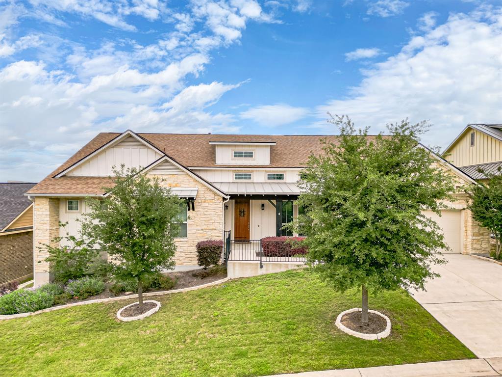 This home delivers true WOW factor from the moment you arrive. With striking curb appeal, it’s designed to impress—featuring a beautiful stone exterior, stylish metal roof accents, and an expansive front porch perfect for relaxing while overlooking the serene, oak-filled community park just across the street. Inside, the thoughtfully designed floor plan offers both elegance and functionality. A private study sits just off the entry, while the oversized living room provides the perfect space for entertaining. The spacious island kitchen shines with modern white cabinetry and flows seamlessly into a generously sized dining area—ideal for gatherings of any size. Freshly painted throughout, the home feels current, bright, and move-in ready, awaiting your personal touch. The oversized primary suite is a true retreat, offering space for a sitting area and complemented by a luxurious, spa-inspired bathroom. Enjoy an oversized oval soaking tub, dual vanities, and a beautifully appointed walk-in shower. Step outside to the large covered back patio, where vaulted ceilings and exposed beam accents create an inviting space to unwind or entertain—perfectly completing the home’s grand design. This exceptional property truly has it all—don’t miss your chance to see it in person. Schedule your showing today.