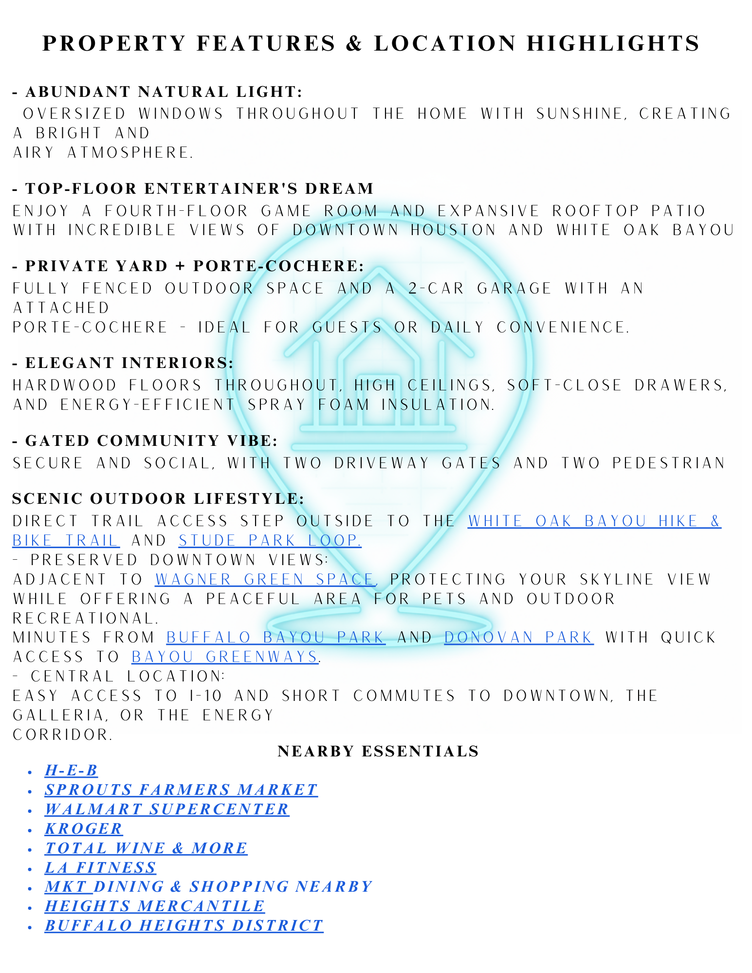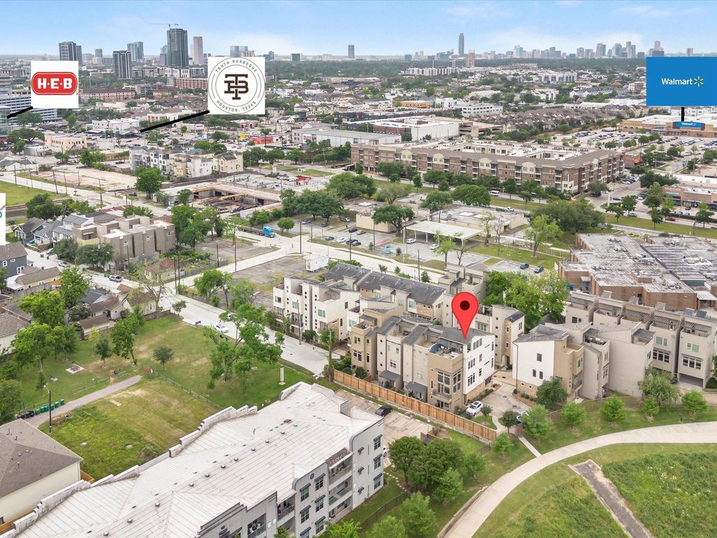 This exceptional 4-story offers sophisticated urban living with thoughtfully designed spaces on every level. 1st floor features a private guest bedroom with full bathroom, The 2nd floor showcases an open concept layout with a gourmet kitchen, spacious living room, and primary suite complete with a spa-inspired bathroom, expansive walk-in closet, and private balcony perfect for morning coffee. The 3rd floor impresses with a loft area, office nook, laundry room, and a second primary suite mirroring the one below with its own bathroom and walk-in closet. The 4th floor, featuring a flexible living space with wet bar and full bathroom that can serve as a bedroom or family room. Open to a rooftop terrace offering panoramic views of Houston’s skyline, White Oak Bayou, and trails. Enjoy your private gated backyard with seating area. Abundant natural light from floor to ceiling windows throughout, energy efficient, tankless water heater, and custom window treatments and 2026 new roof.