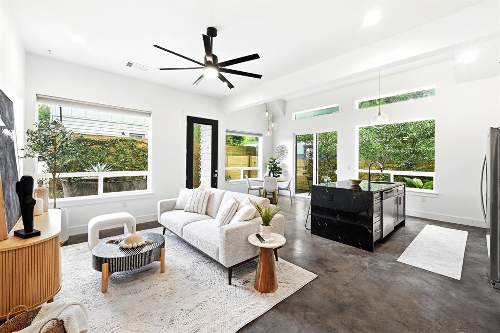 Inside, an open layout features high ceilings, 8-foot doors, and polished concrete floors throughout, with natural light filling the main living spaces. The kitchen includes quartz countertops and stainless steel appliances, flowing seamlessly into the living and dining areas. Both bathrooms offer lighted mirrors, and the primary suite features a beautiful walk-in shower and large walk-in closet.