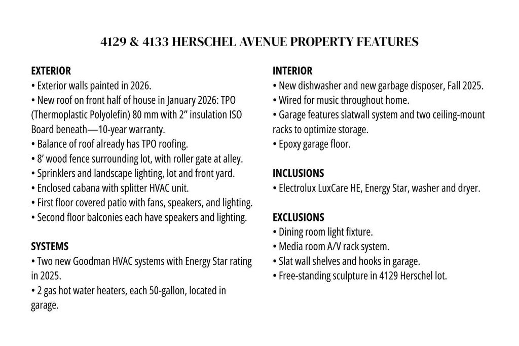 Welcome to a true urban oasis—and development opportunity—in the heart of the city. This special offering involves two properties, each priced separately: the single-family attached residence at 4133 Herschel Avenue, priced at $1,450,000, and the adjacent, landscaped, full-size lot at 4129 Herschel (MLS #21212514, priced at $1,150,000). The Owners strongly prefer to sell both properties together. The 3,221 square foot home, designed by acclaimed architects Mitchell-Garman, is a study in thoughtful architectural expression. Clean lines, expansive windows, and a dramatic roof profile define the exterior. Within, a light-filled open plan creates a serene and comfortable environment for informal living. A sequence of family, dining, kitchen, and den spaces, bracketed by a separate bedroom suite and discrete and stylish guest bath, occupy the first floor. Upstairs, the light-filled rooms include two spacious primary suites, each with luxurious bath and private balcony, and a separate media room. Recent improvements include two all-new HVAC systems and the addition of a new TPO membrane roof on the front half of the house to match the back half. The sun-drenched lot—artfully reimagined by the current owners as a private garden with expansive lawn, ornamental trees, stone terrace, enclosed gazebo, and night lighting—joins with the house as a perfect setting for indoor-outdoor play, dining, relaxation, and entertaining. Measuring 50 x 144, the lot could be kept as it is, reenvisioned, or developed anew under the possibilities of PD 193 (MF-1) zoning. These exceptional properties, both with the additional benefit of alley access, enjoy an enviable location in Dallas’s chic and sought-after SOHIP neighborhood, steps to the restaurants, shopping, and walking corridors of Highland Park, Oak Lawn, and Turtle Creek.