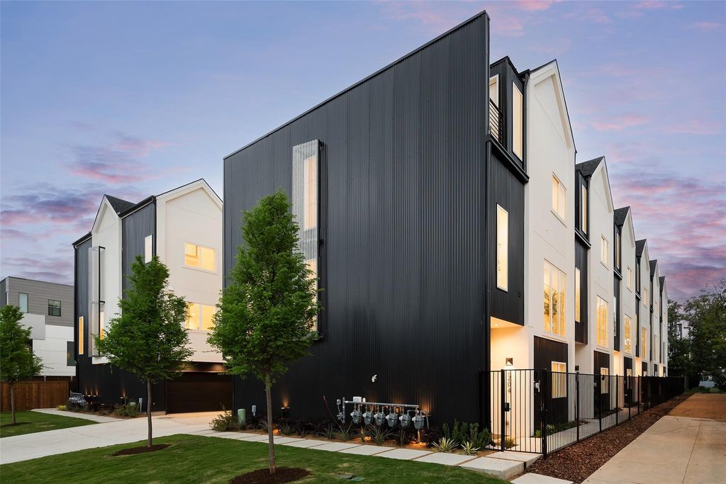 The primary suite features vaulted ceilings, a walk-in closet, dual vanities, soaking tub, and separate shower. A private roof deck adds versatile living space and opens to a rooftop deck with stunning downtown Dallas views.